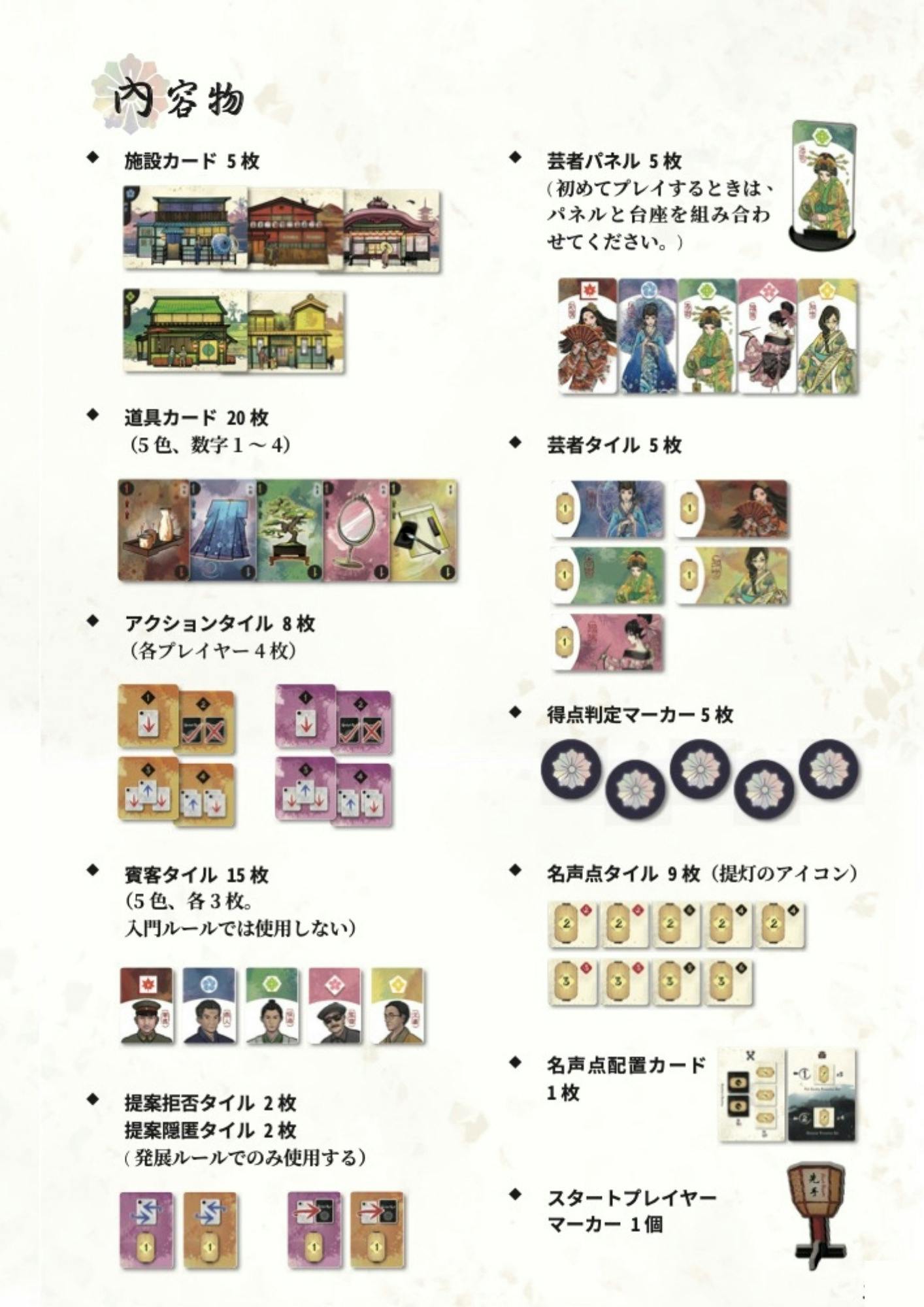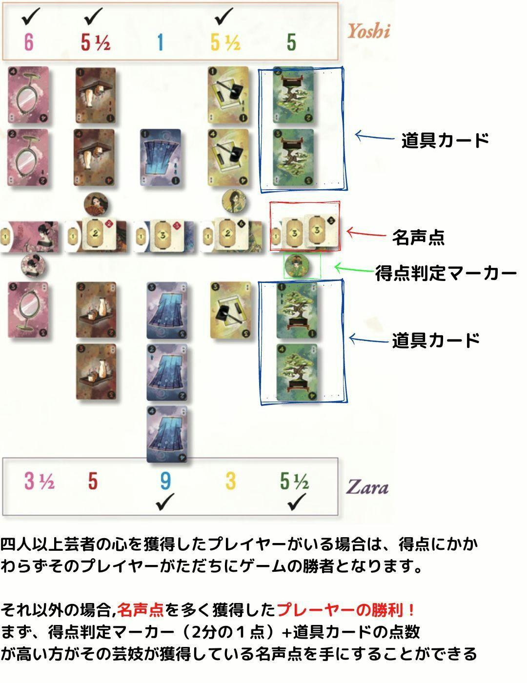 カードを使うことで、芸妓たちが施設を巡って客に芸を披露する手助けをします。芸妓たちは、自分の属する施設に戻ってくると名声を獲得します。4ターン後、各ラウンドの終了時に、各プレイヤーの影響力を比較し、どちらが芸妓の名声点を得るかを判定します。4人以上の芸者の心を獲得したプレイヤーがいる場合は、得点にかかわらず、そのプレイヤーがただちにゲームの勝者となります。それ以外の場合は、名声点がより高いプレイヤーが勝者となります。