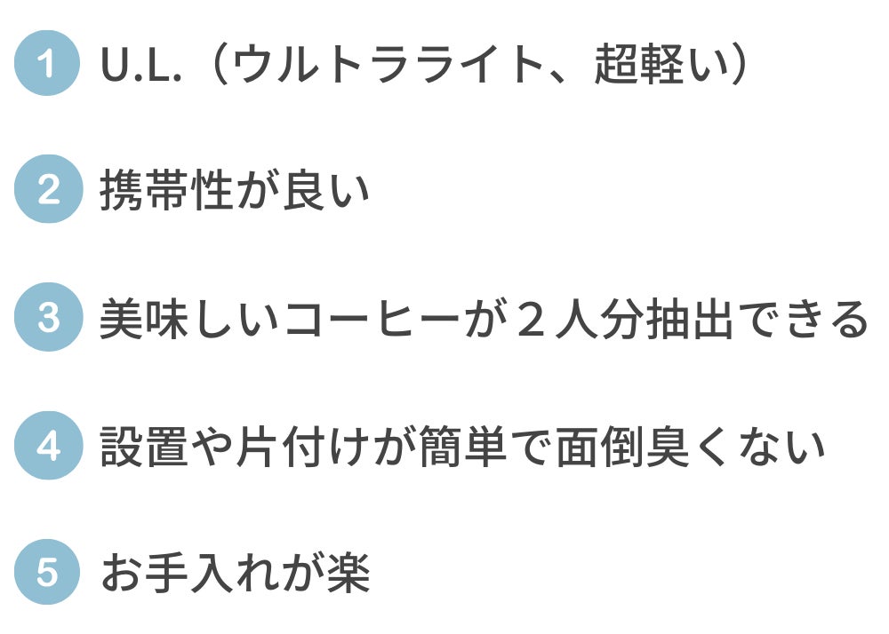 これら5つは、コーヒーが好きで U.L. Hiker (ウルトラライトハイカー)にこだわる「YAMATOMO.FUN」として譲れない条件でした。