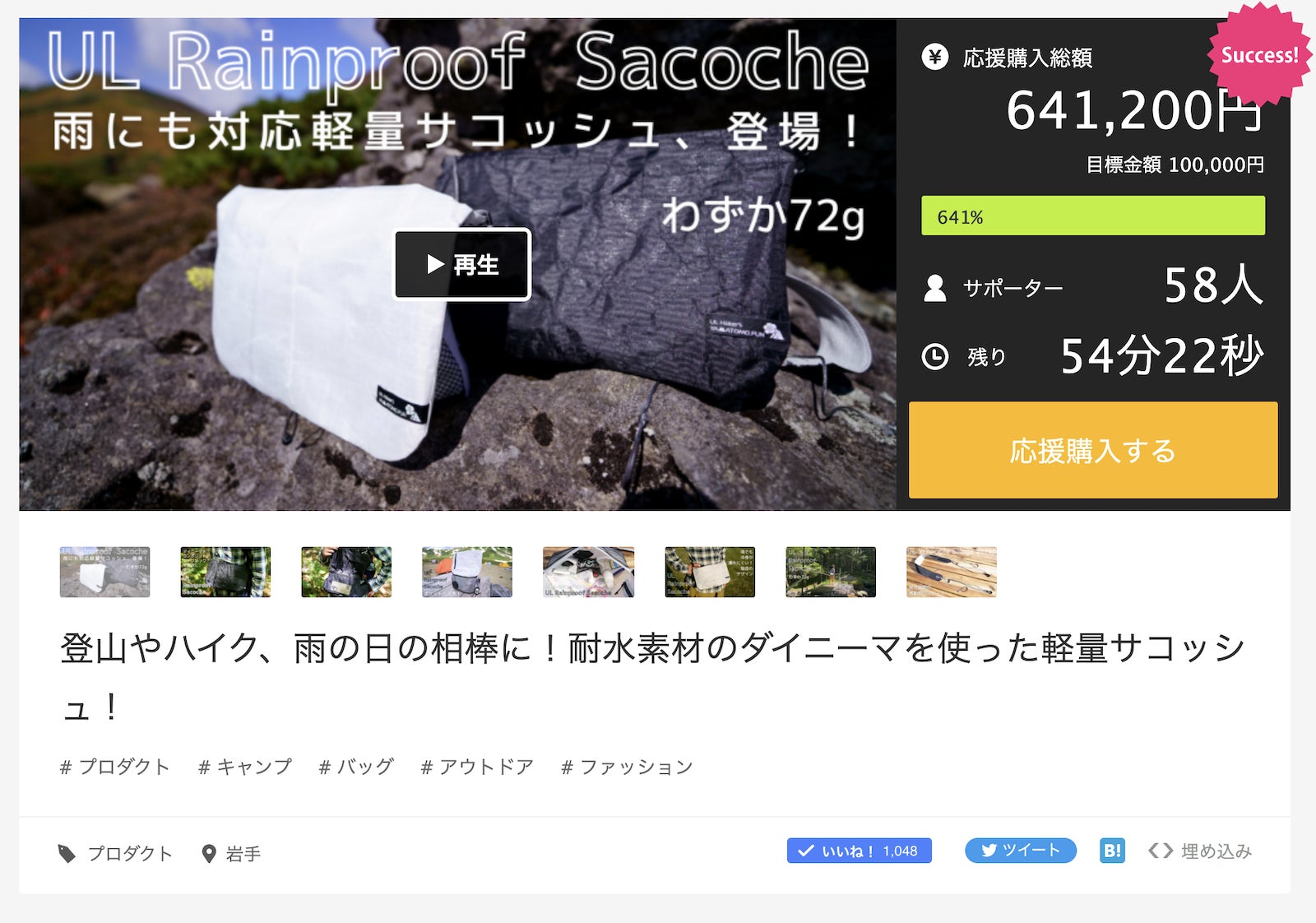 ● Makuakeで【 UL Rainproof Sacoche 】先行予約販売、目標金額640%以上、完売達成!
