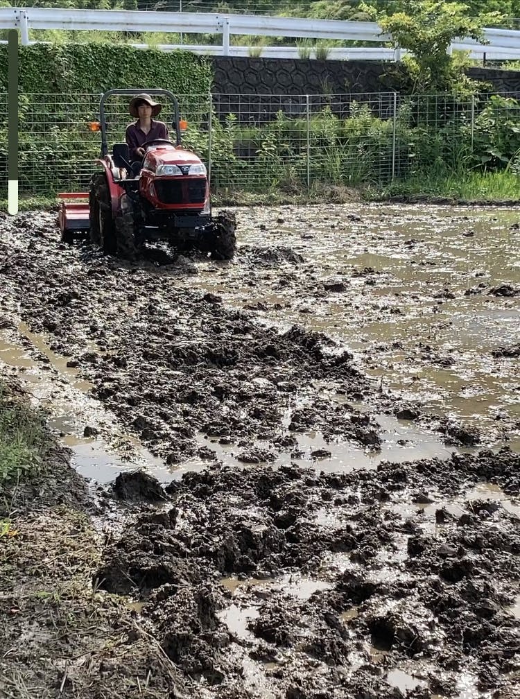 米作りの師匠に教わりながら、スタッフよーへがトラクターで代かきをしました。