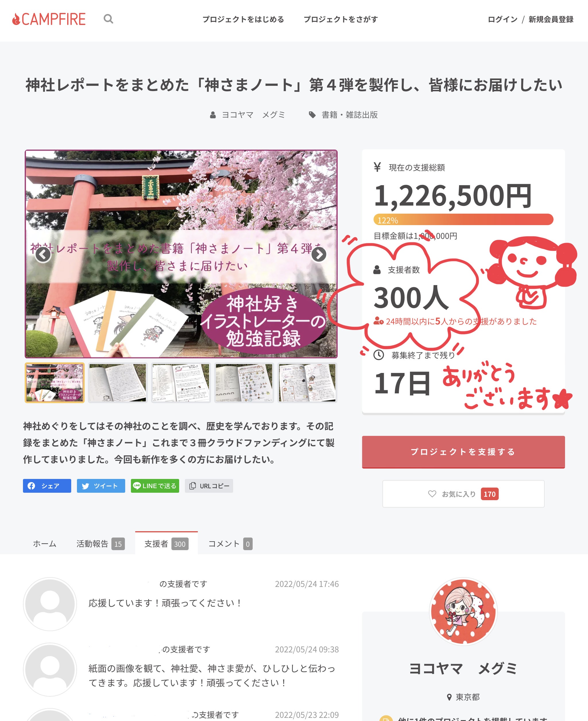 こんにちは。横山です。4月29日から始まったクラウドファンディングのプロジェクトも気づけば残り3日となりました。これまでご支援いただいた皆様、本当にありがとうございました。私はもちろん、皆様にとってのゴールは「神さまノート4」を手にすることです。まだまだ気を引き締めて製作頑張ります!皆様からのエールが何よりの力になっています。本当にありがとうございます。今回の画像は群馬県の榛名神社の大鳥居です。青空に真っ赤な鳥居が映えてます。いただいたコメントに返信させていただきます。・いつか北海道の神社も紹介してほしいです(^^)次も楽しみにしています! ありがとうございます!夫の故郷でもある北海道の土地には私も愛着がたっぷりあります。一時期開拓の歴史など調べていたので、また改めて深めたいと思っています。必ずやいつか実現させます☆・イチタンファミリーです!いつも応援してます いつも支えていただいて本当に感謝しています!これからも一緒に支え合いながら元気に頑張ろうね!・旅行に行く時の必須アイテムだし、子どもが好きで読み聞かせにも使ってます。笑楽しみにしてますー! ありがとうございます!読み聞かせに!!嬉しすぎますっ!!擦り切れるまで可愛がってやってください♡・神さまノート1~3を読ませていただいてます。4も楽しみにしています。暑くなってます、どうぞご自愛ください。 ずっと楽しんでいただいていることが本当に嬉しいです。ありがとうございます。神さまノート4も可愛がっていただけるよう、製作頑張ります!お気遣いのお言葉、ありがとうございます!・応援しています!頑張ってください!作り手のお気持ちが伝わってくるような、暖かみが感じられました。楽しみにしています! ありがとうございます。嬉しいです。製作している時が大変だけど何より楽しいので、それが伝わったらいいなと思いながらいつも製作しています。お手に取っていただいた時にもそう感じていただけるよう、頑張ります☆・祭礼用具を製作しています。神社や祭を巡ることはあっても、あまり「楽しむ」という視点ではありませんでした。趣味と実益を兼ねて、楽しく面白く勉強できたらと期待を込めて、届くのを心待ちにしています! 関係者さまにも興味を持っていただけてとても嬉しいです。とても気持ちが引き締まります。元々何も知らなかったので知ることの楽しさを共有していただけたらと思いながら製作しています。楽しんでいただけますように☆・応援しています!頑張ってください!友人からオススメされて、仲間で応援してます。楽しみです♪ 嬉しいです!ありがとうございます。一緒に楽しめる仲間がいるって素敵ですし、とっても羨ましいです。そして何より共通アイテムが「神さまノート」になっていることが幸せです。頑張ります!・神さまノート、楽しみにしています!! ありがとうございます!製作している私自身楽しいのですが、それを共有していただけたら本当に嬉しいので、早くお届けできるよう、頑張ります。・今迄存じ上げませんでしたが、1から購入出来そうなので楽しみにしています。これからも頑張ってください たくさんあるクラウドファンディングのプロジェクトから見つけてくださり、またご支援いただき本当にありがとうございます!クラウドファンディングの目的は予算はもちろんですが、こうして新しい読者のご縁をいただくことなので、こうしてご縁をいただけること、本当に嬉しいです。今後ともどうぞよろしくお願いいたします。・回数こなす度にプロジェクトが大きく進化していきますね。僕は可愛いイラストにハマりました♪とても楽しく拝見させていただいております。合わせて毎回心のこもった梱包に感激ですノートが届くまでワクワクしております。待っている期間も楽しんでおります、くれぐれも無理せずマイペースで作業進めて下さいね(^^) ずっと前から支えていただき、本当にありがとうございます。おかげさまでどんどん神さまノートの輪が広がっていてとても嬉しいです。今回も一つ一つ心を込めて赤い糸を結ばせていただきます♡お気遣いのお言葉までありがとうございます。頑張ります!頑張れます!・私も神社巡りが好きなので読んでみたいです!楽しみにしています。 神社巡りハマりますよね。古代から続く地域の人の祈りが現代にもつながっている貴重な場所。ずっとずっと大事にしていきたい場所ですよね。楽しんでいただける一冊になりますように製作頑張ります!ありがとうございます。・たまたま見つけたのですが、とても惹かれる内容で支援させていただきました。応援しています!頑張ってください! たくさんあるクラウドファンディングのプロジェクトの中、見つけてくださり、またご支援いただきありがとうございます!こうしてご縁をいただけることが何より嬉しいです。ご期待に添える一冊になりますよう、製作がんばります☆・かわいいイラストで神社について学べて