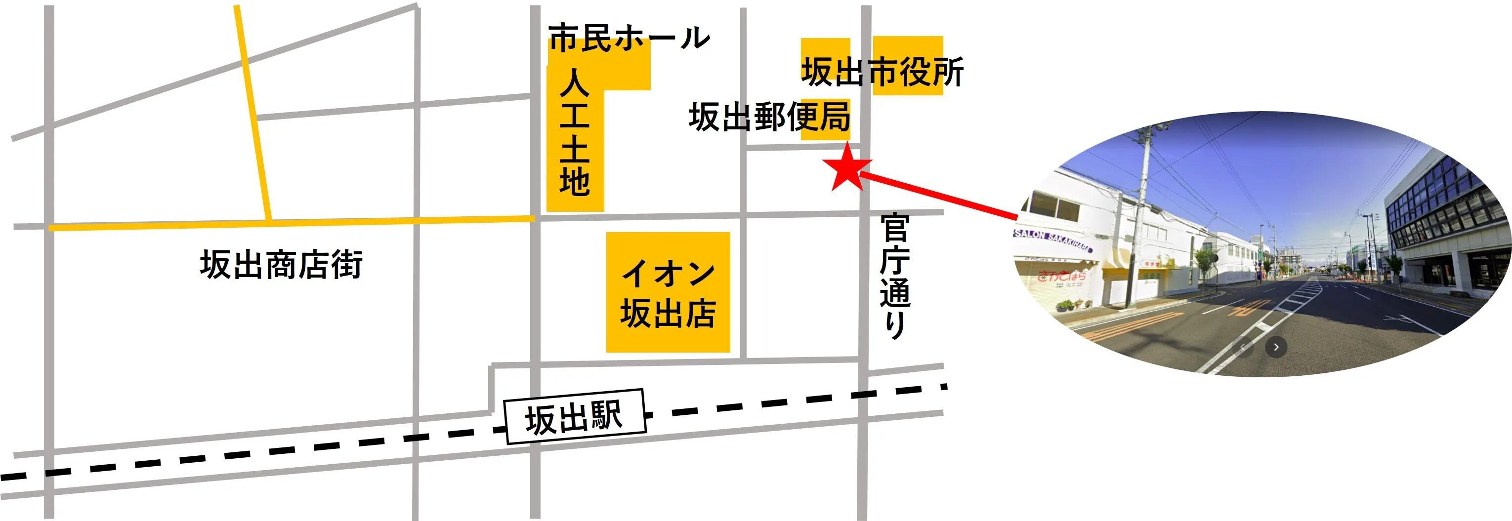 坂出市役所の目の前にあり、カフェや喫茶店、郵便局など坂出市内では 人の往来が比較的多い場所に位置しています。