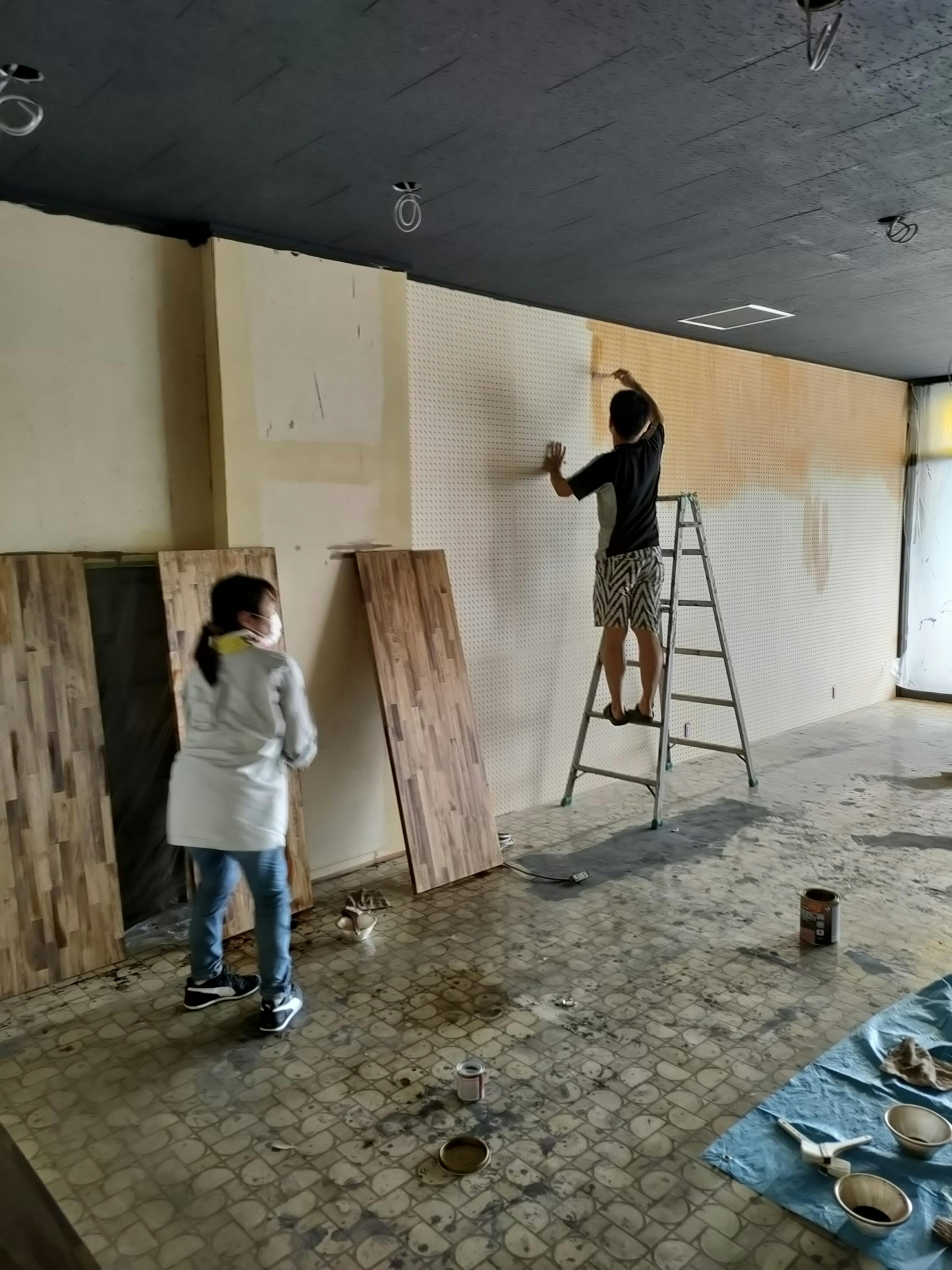少しでも節約するため、先日自分たちで天井やテーブルの塗装をしました。