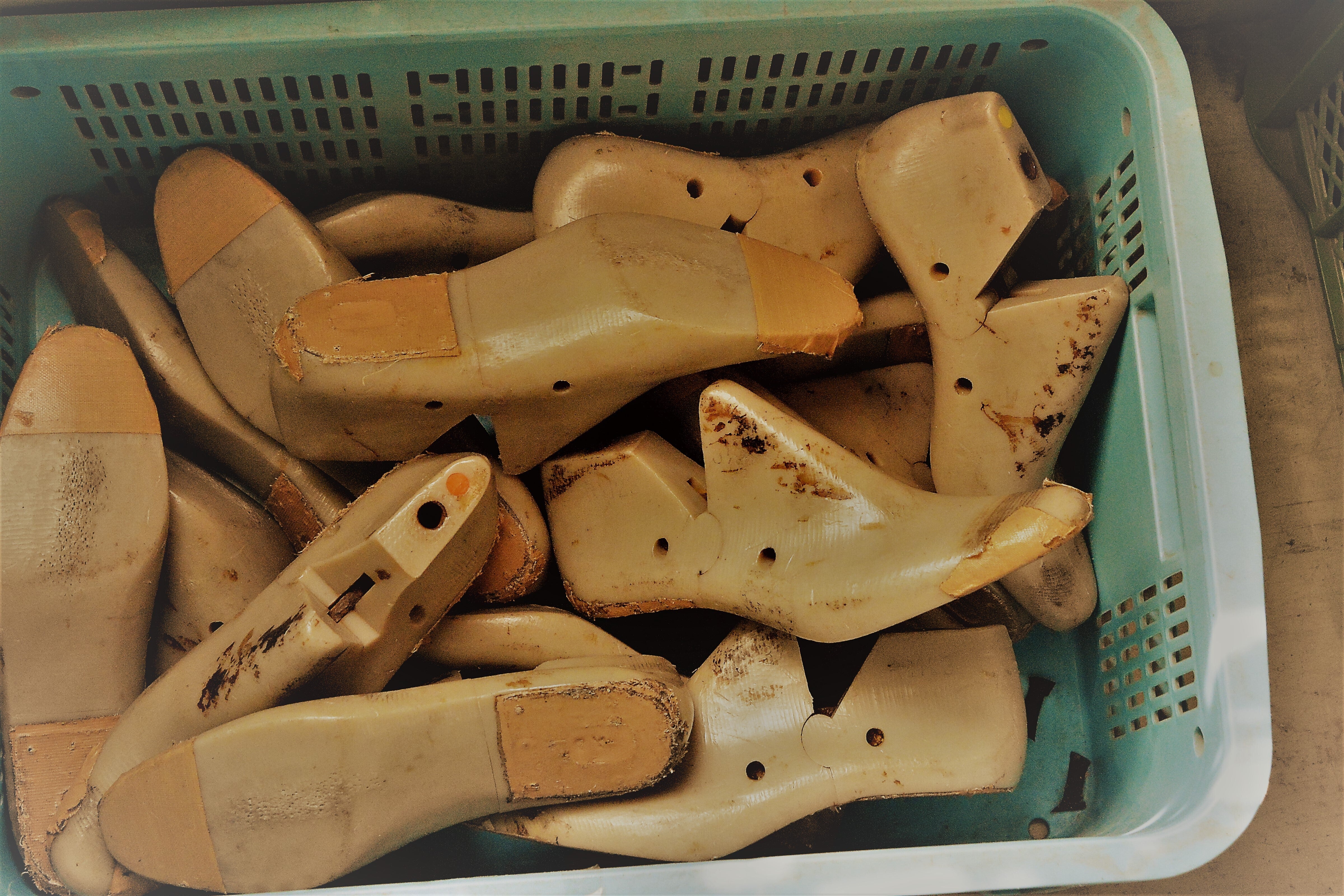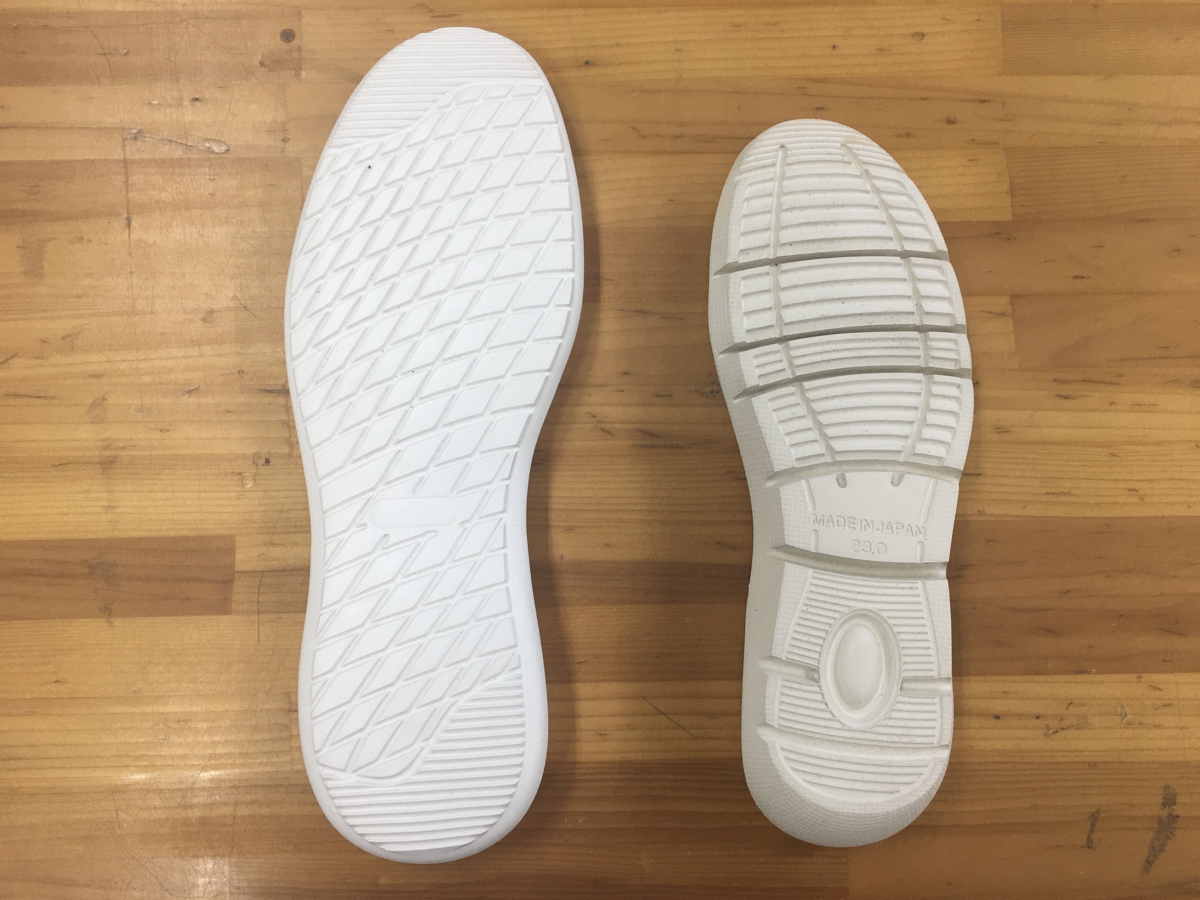 レディースのサイズ展開は24.5cmまでが一般的。メンズまで展開するには28cmまでモールドソールを新しく作らねばなりません。上記の金型に流し込む材料を調合するのに、1000足が最小ロットになります。輸送費、加工費などを含めてここで90万。