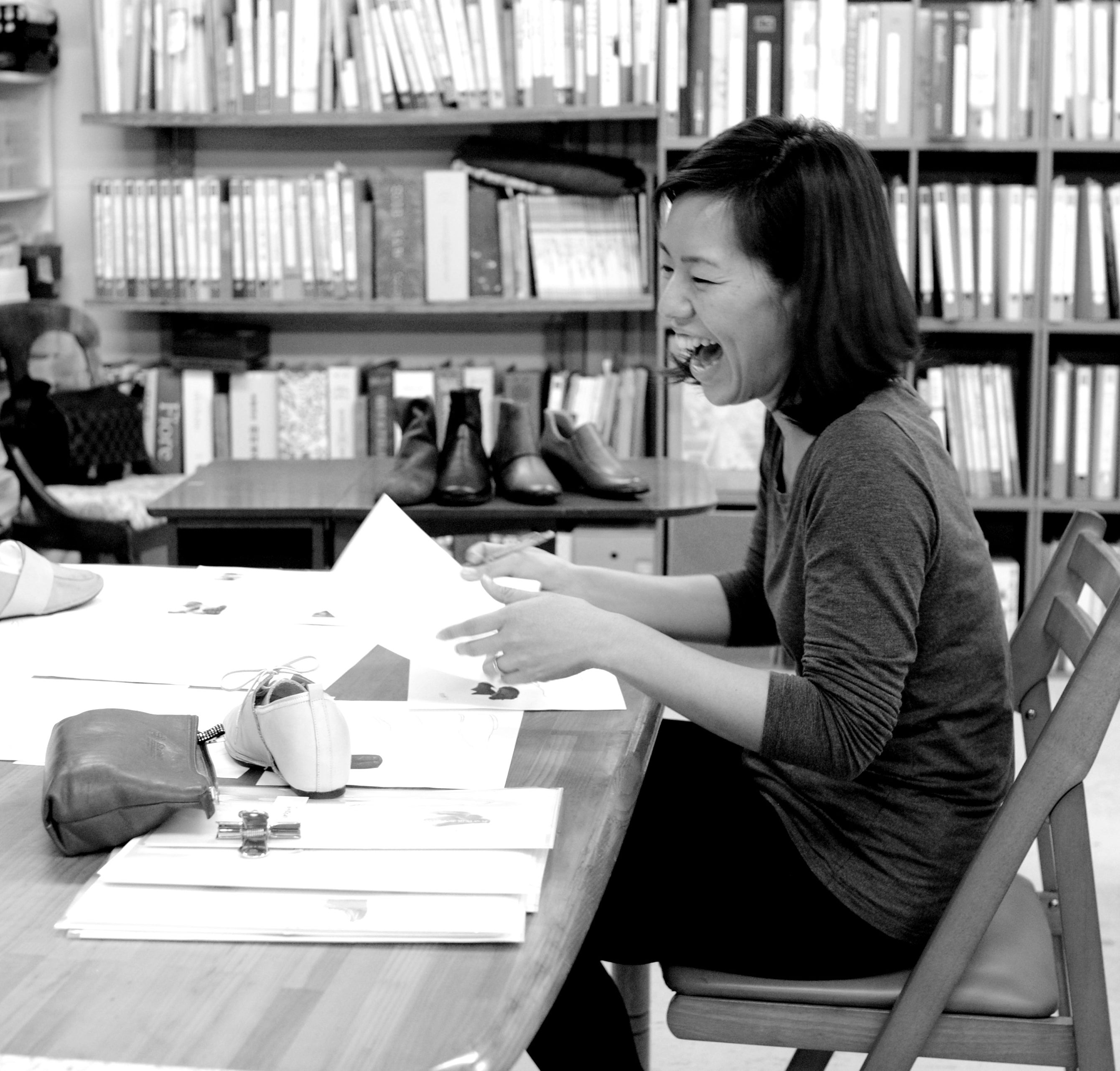 靴工房JUMBOの商品開発リーダーで、デザイナーの大石絢子です。靴工房JUMBOの魅力にハマって、27歳でオーナーである現会長に会いに行き、「給料なしでいいので働かせてください!」と豪語。ちゃっかり給料付きで雇われはや13年。