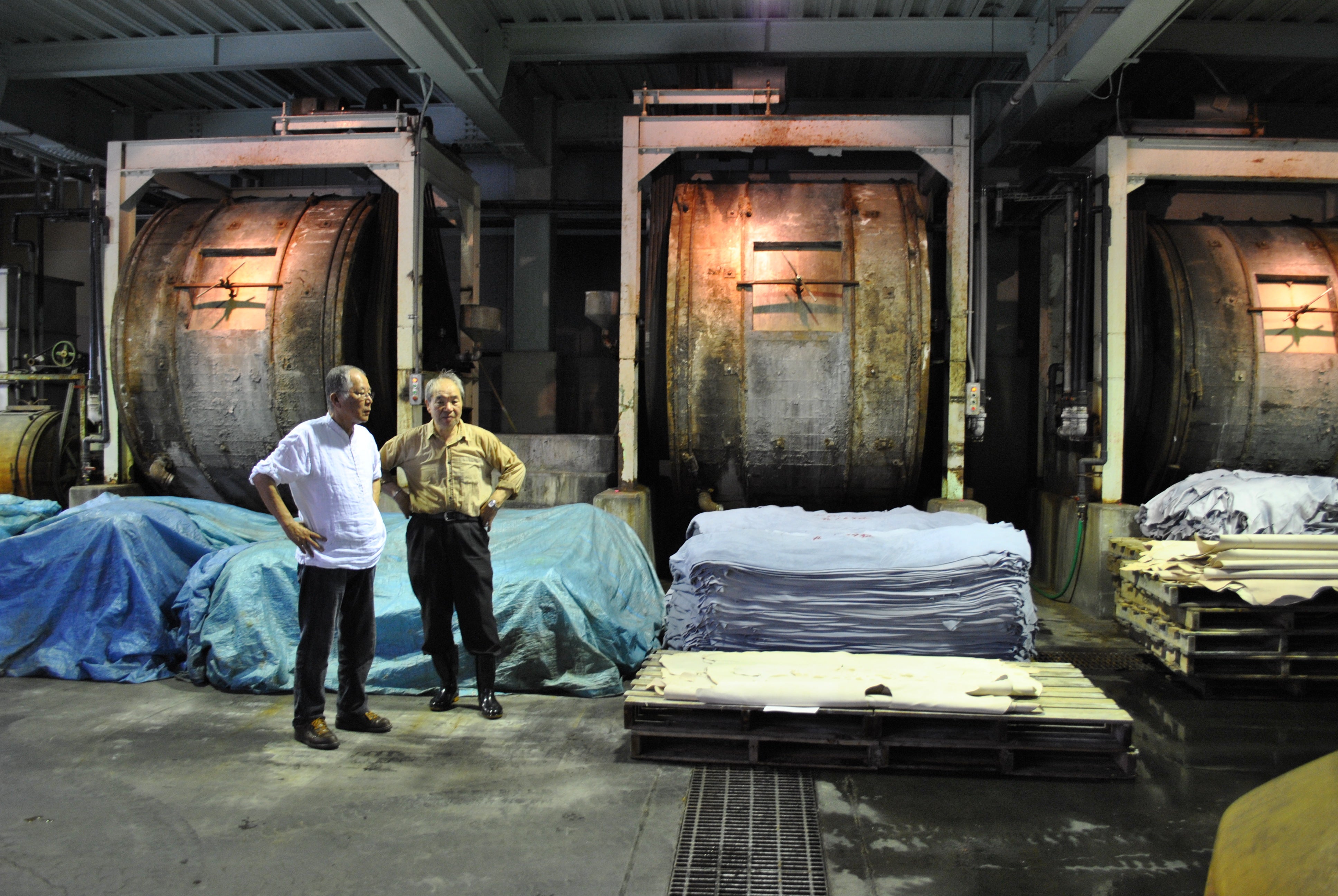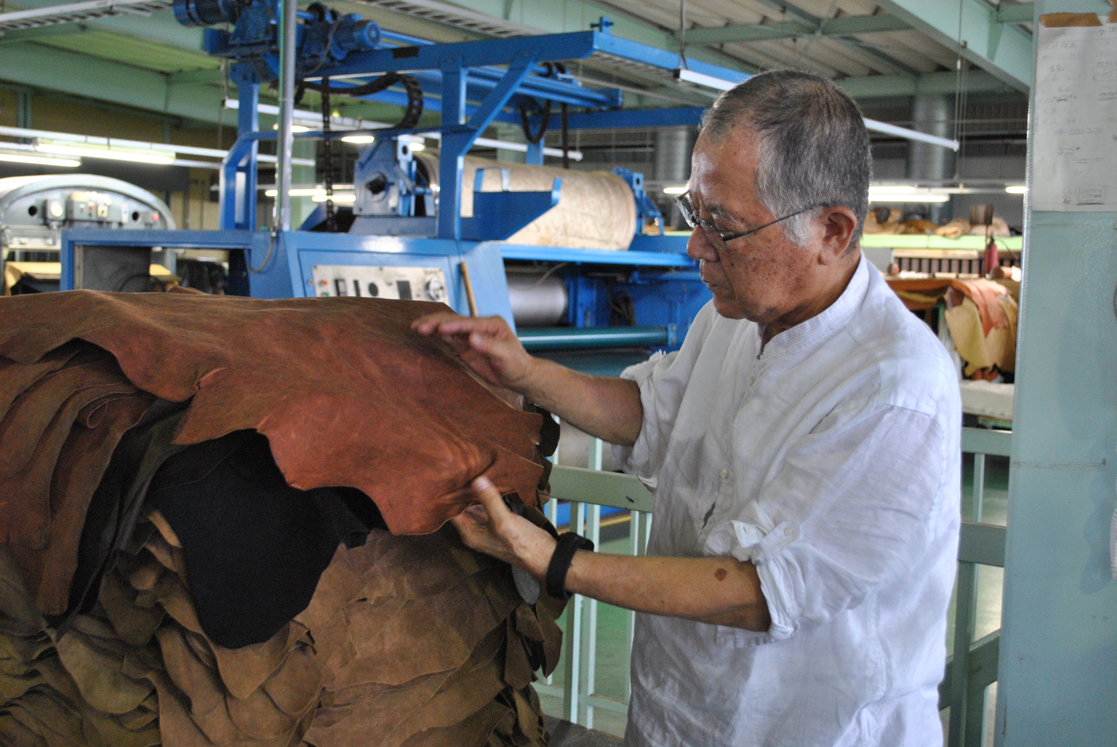 姫路のタンナーで職人と話す創設者で会長の田村繁幸
