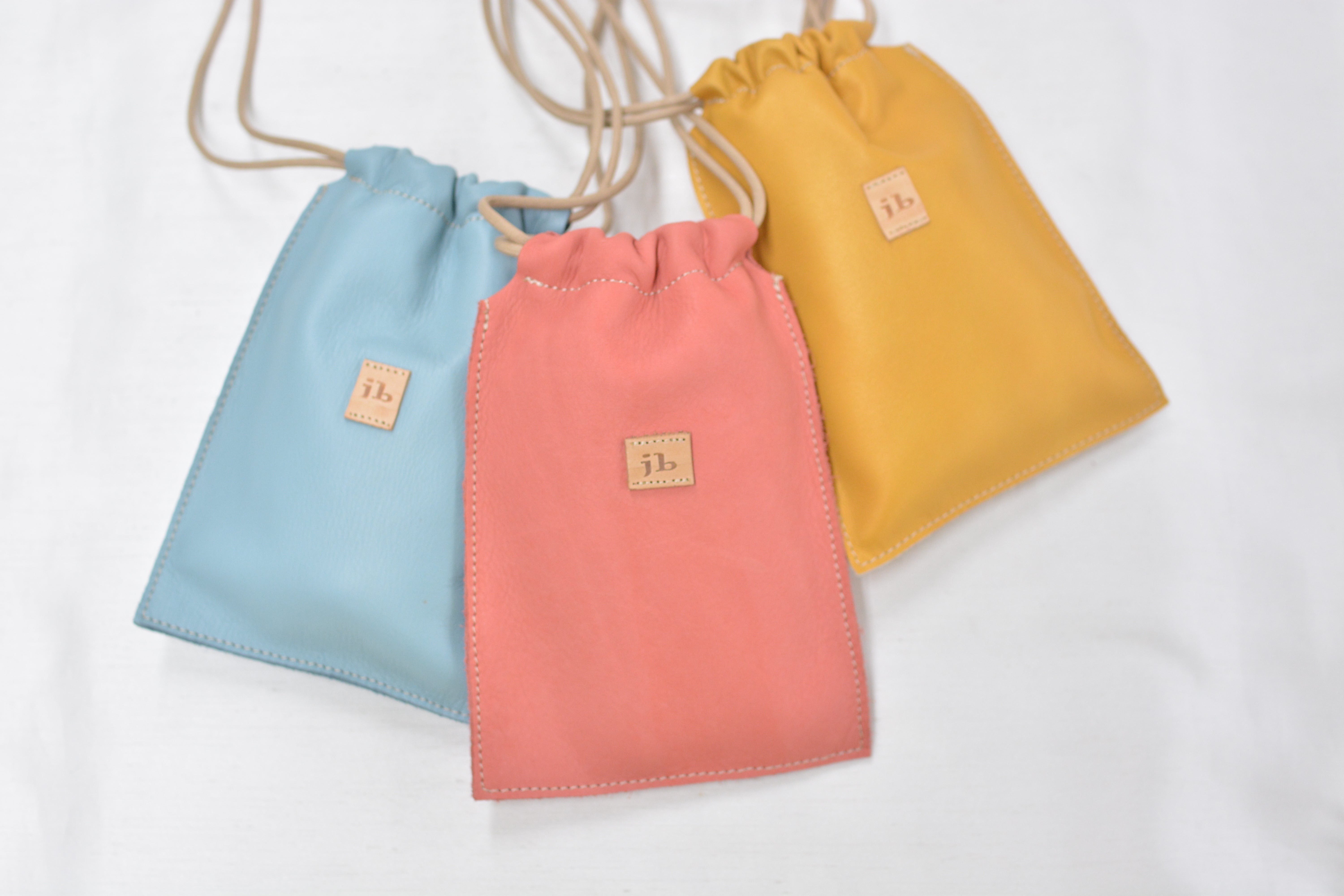 靴工房JUMBOのソフトでカラフルな革を使った可愛い巾着。ちょうどスマートフォンが入る程度のサイズです。(縦17.5cm✖️横13cm)天然皮革独特の風合いで使い込むうちに柔らかく馴染んできます。裏張りなどはしていないので色落ちは避けられません。巾着の紐は長めに設定しています(靴紐を使用しています!)到着後、ご自分の使いやすい長さに調節可能です。