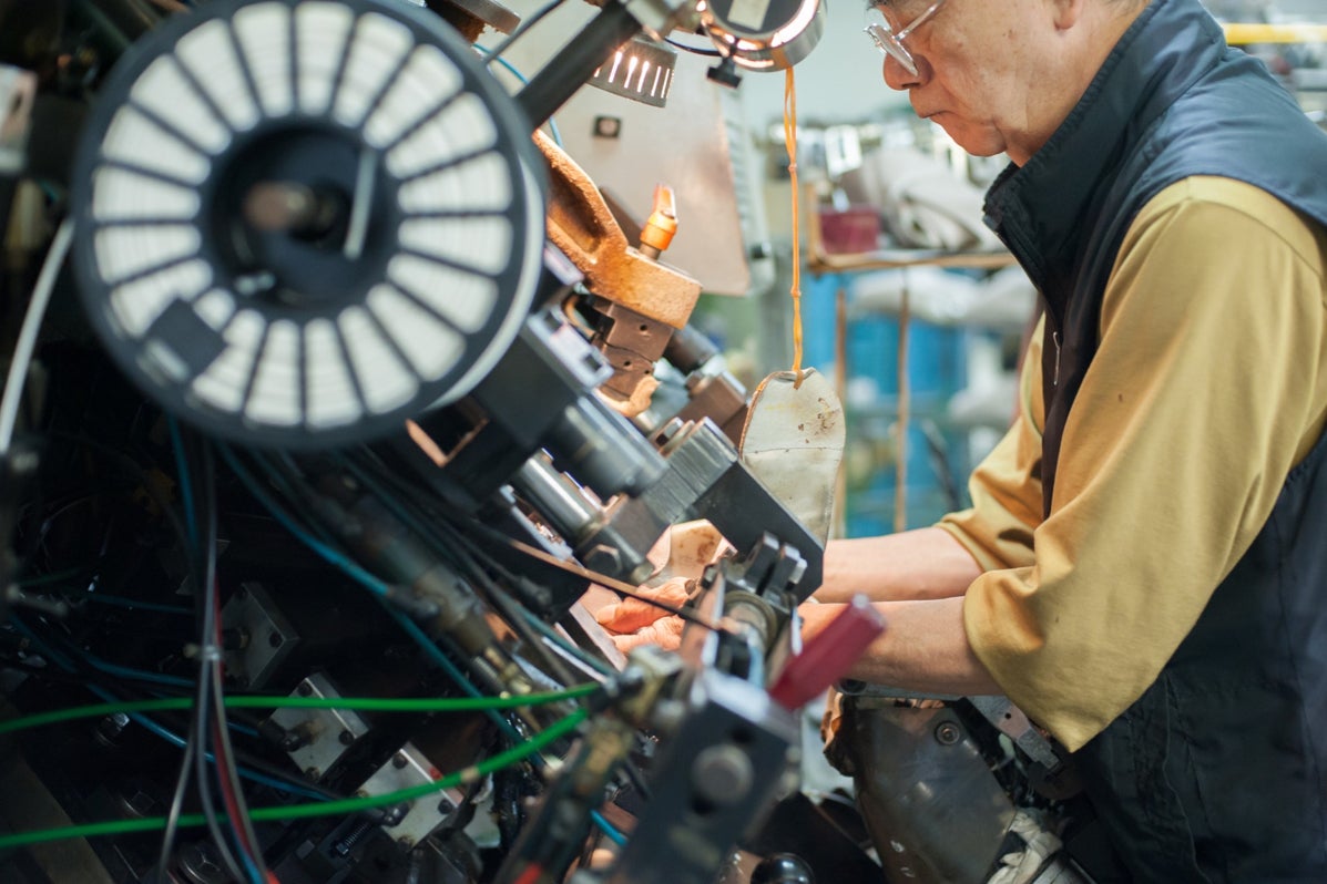 定時になると、作業はどこからともなく始まります。機械の音、ハンマーの音、アイロンの音。お姉様たちの笑い声。