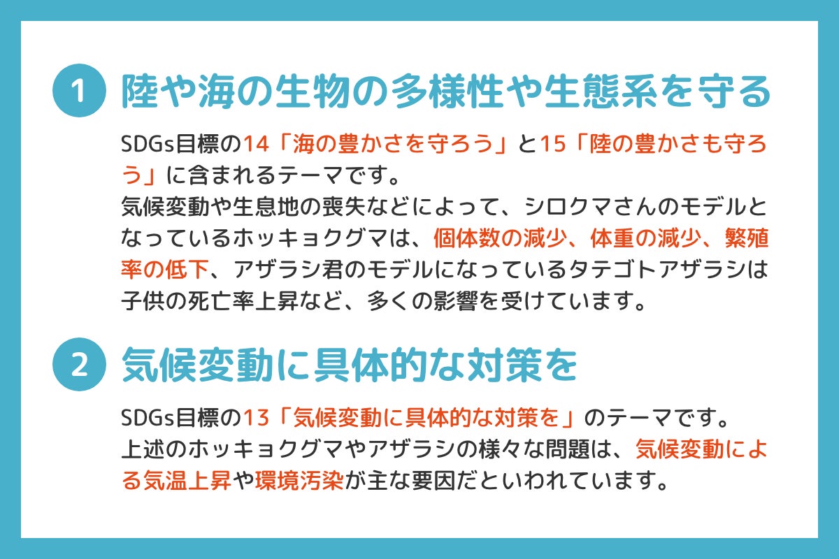 そして私たちは、この「恋するシロクマ」を通じて、北極で起きていること、シロクマさんやアザラシ君に迫る危機、SDGsが掲げる「生物の多様性」「気候変動」について、より多くの方に伝えたいと考えました。