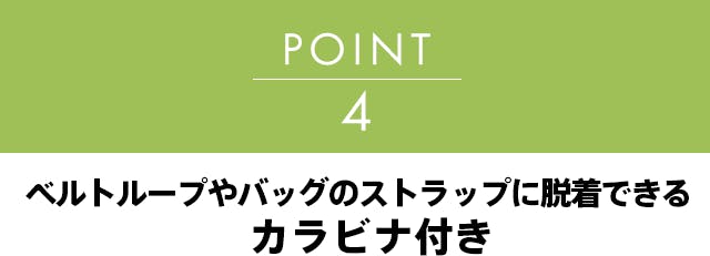 【NOVICKY】はパンツのベルトループや、ショルダーバッグのストラップなどに簡単に取り外し可能なカラビナ付き。