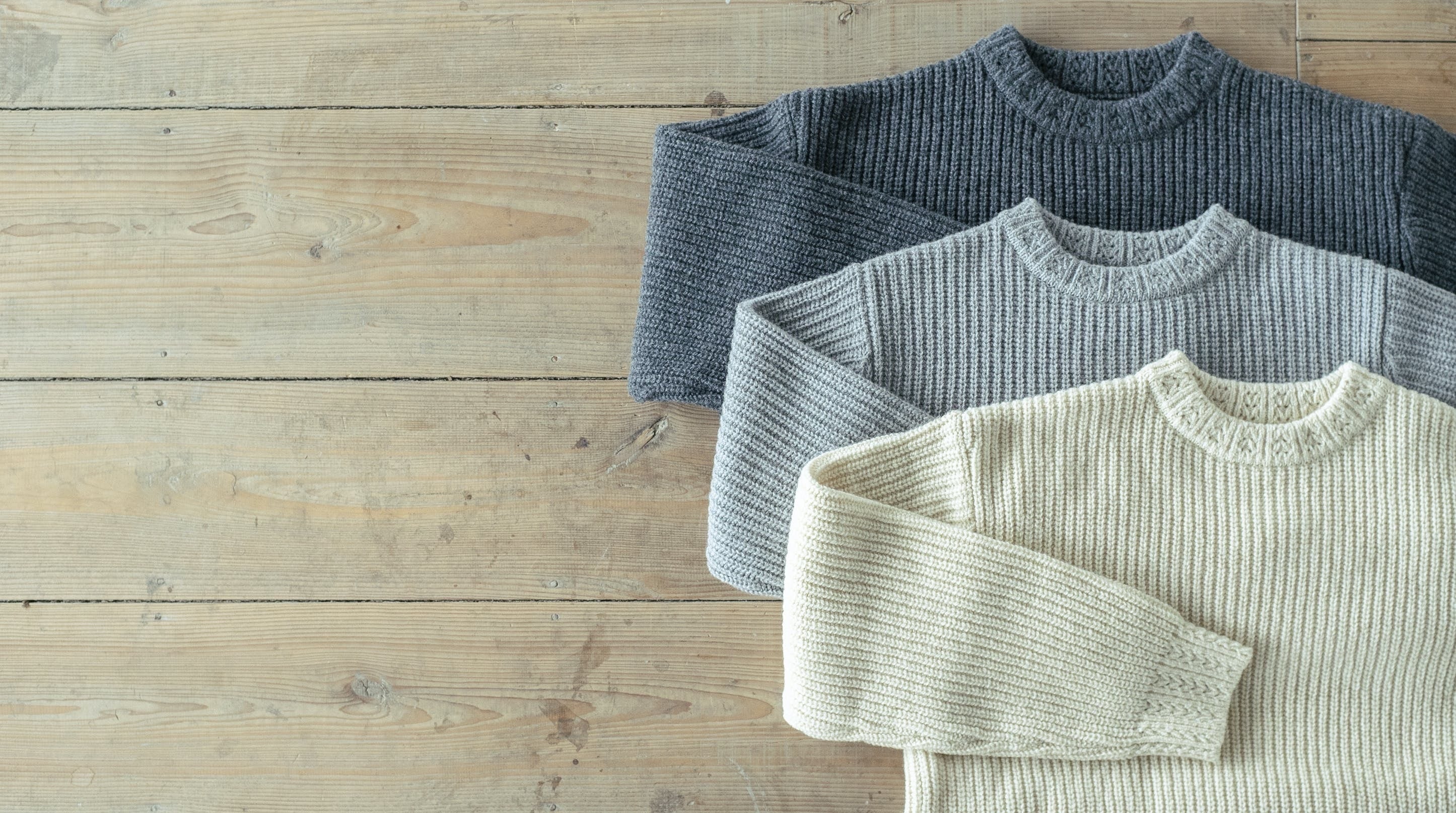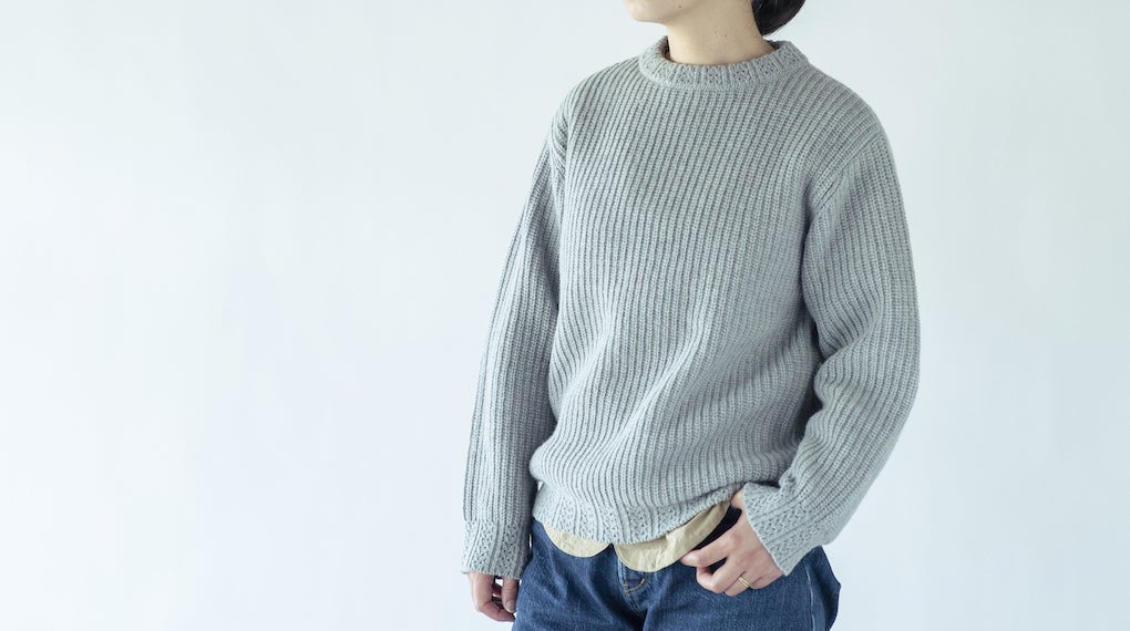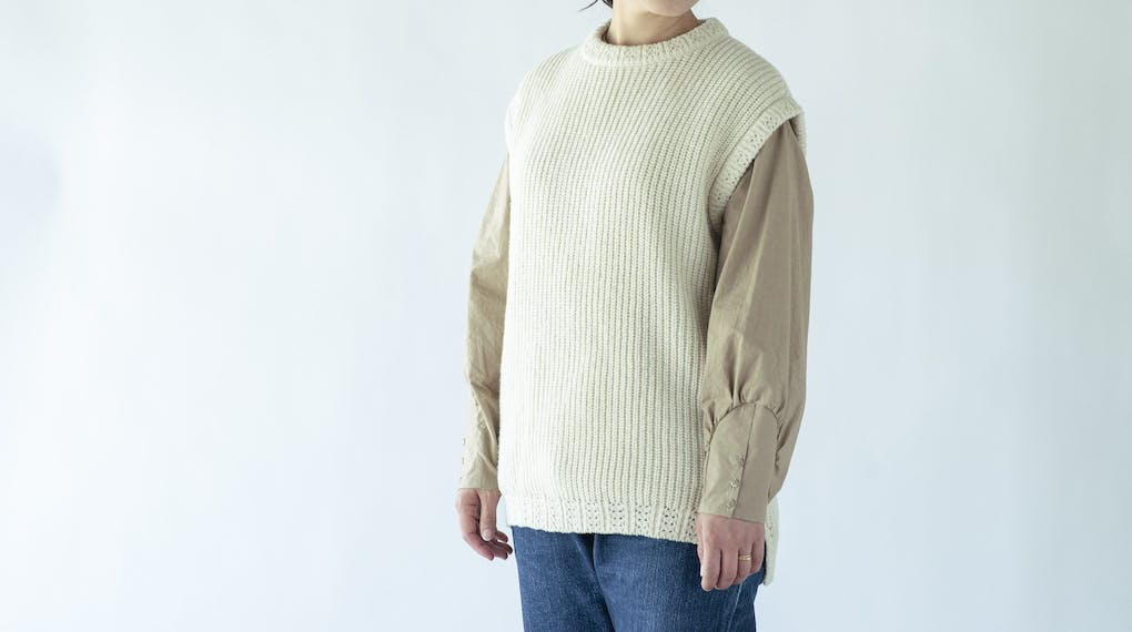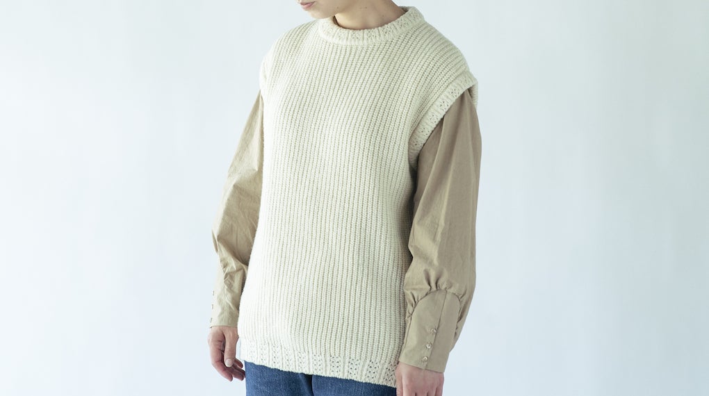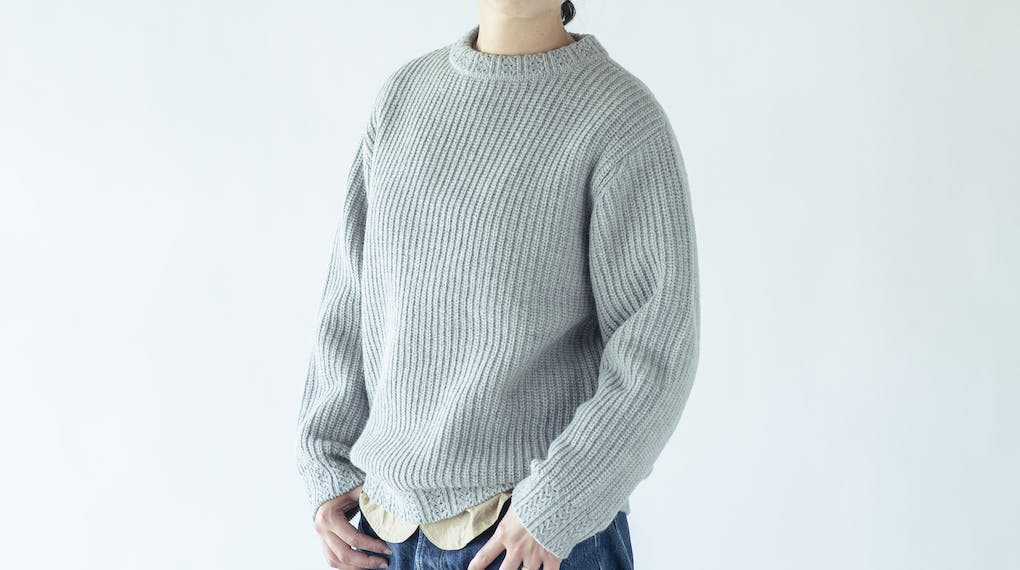 国産羊毛の特長でもあるコシの強さを残しつつ、近年好まれる傾向にある「やわらかいニット」に仕上げるために、オーストラリアのメリルウール羊毛を70%ほど糸に混ぜる調整をしました。型崩れしづらくシルエットがしっかり出るので、カジュアルになりすぎずビジネスシーンでもご着用いただけます。衿や裾には個性的な模様編みを入れました。