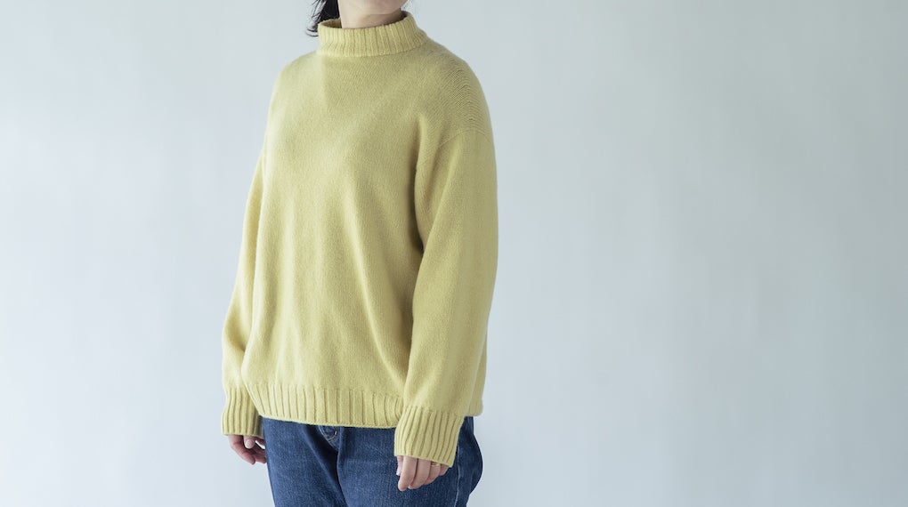 衿の高さや肩、袖回りのシルエットにこだわった上品なデザインを意識しながら、衿や裾に模様編みを入れることで、シンプルな中に控えめで主張しすぎない個性も表現しました。また、カシミヤよりも手が届きやすい価格に抑えることができました。