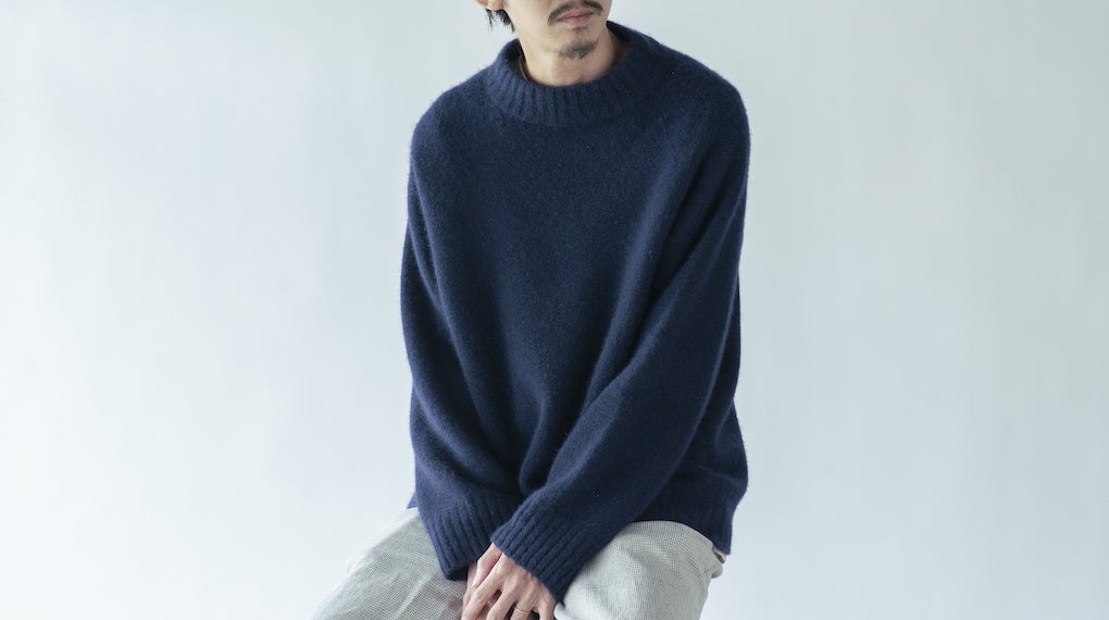 ホワイトカシミヤ100%の糸で作る、非常にやわらかくて肌触りもすばらしいセーターです。私たちのブランドの中でも技術力の高いニット職人さんが、1枚1枚手編み機を使って仕上げています。全体的にゆとりをもたせた作りになっていますので、男女問わず幅広くお楽しみいただけるアイテムです。カシミヤの着心地、その軽さとあたたかさを一度皆様に味わっていただきたいです。