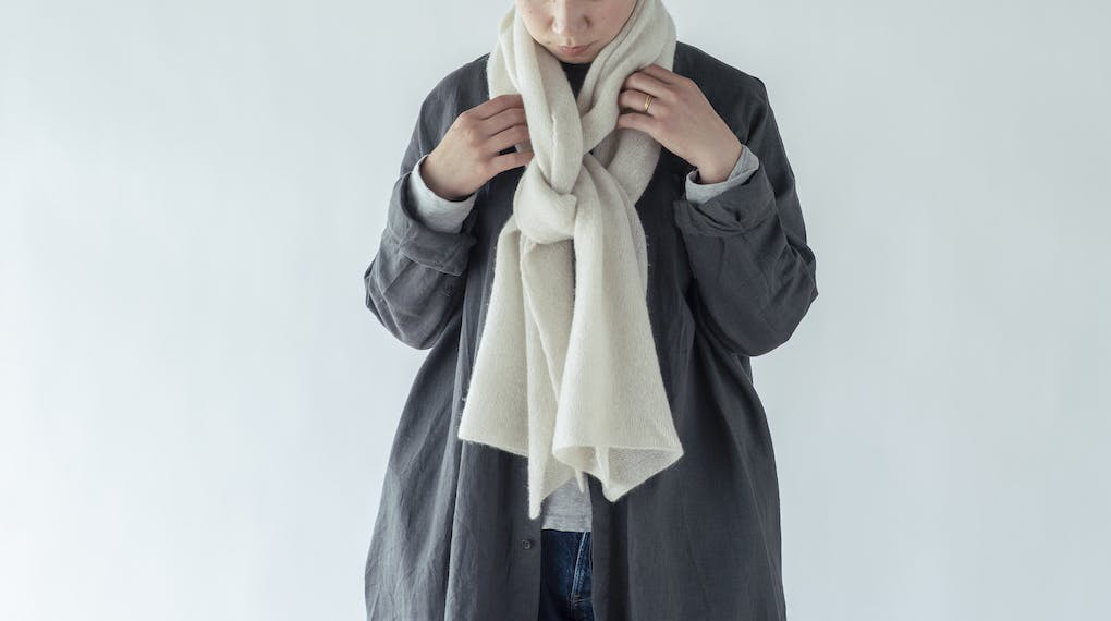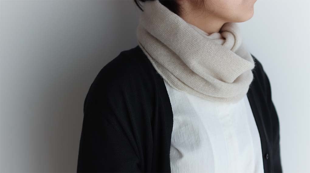 上質なホワイトカシミヤ100%を使用した、首周りをやさしくあたたかく包むストール(大幅・細巾)とスヌードです。昔ながらの「手編み機」と呼ばれる機械を使って、1枚1枚手仕事で編み上げています。大量生産はできませんが、オートメーションの機械による製品にはない、たっぷりと空気を含んだ軽くてやわらかい仕上がりになっています。