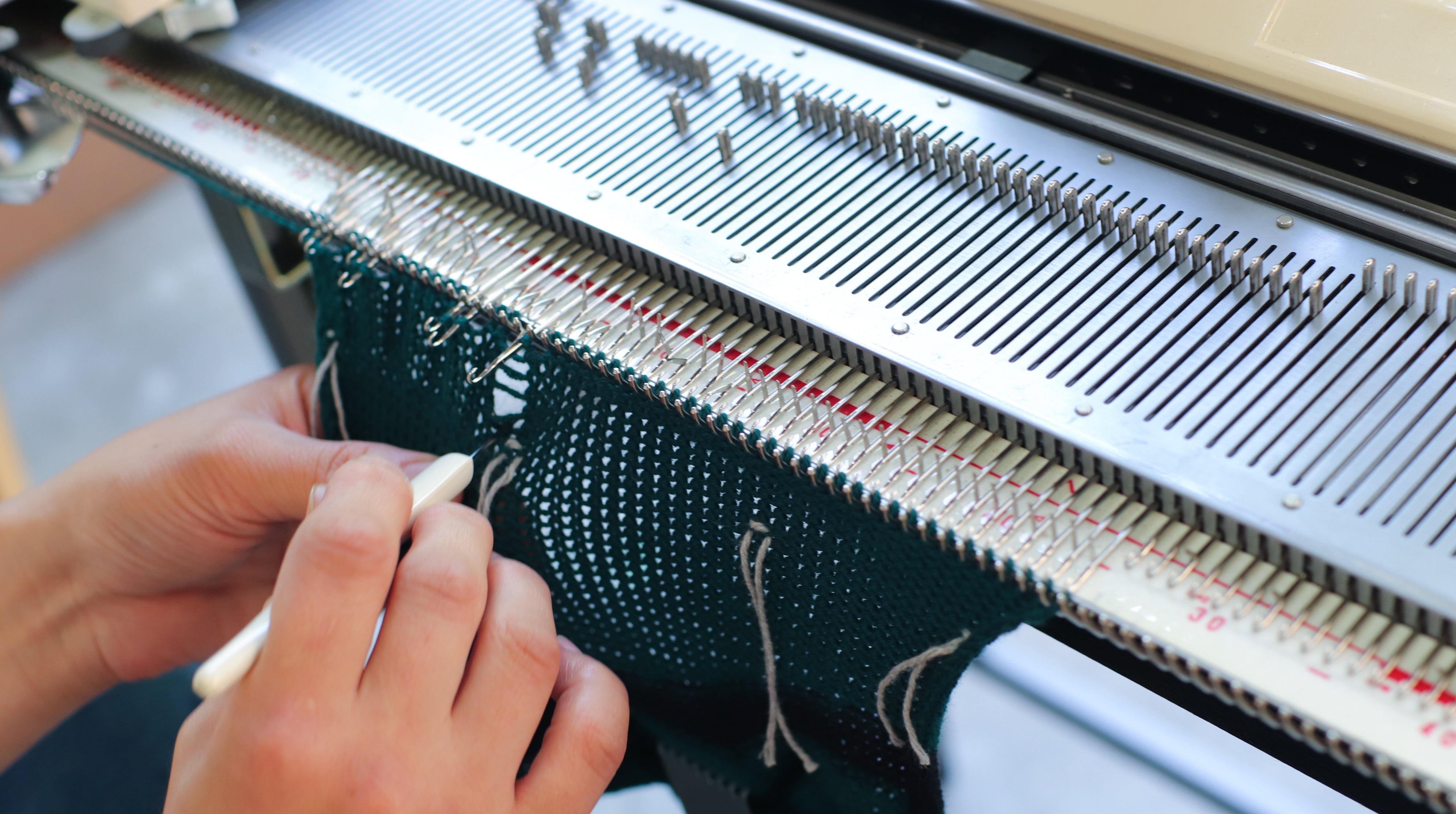 木幡メリヤスでは、ニットを「服の形に編み上げてリンキングという技法で編みつなげる」という製造方法がとられています。デザインの自由度が高く縫製をきれいに仕上げることができますが、非常に手間がかかり、このような作り方をしている工場は他にありません。