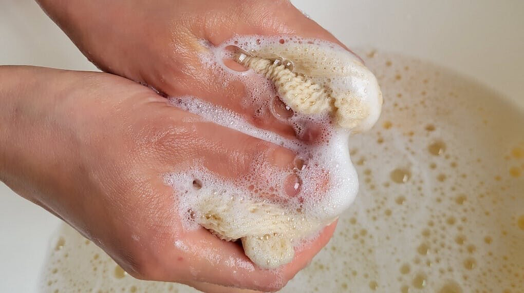私たちのブランドが仕入れている上質な「オーガニックコットン糸」を使用して、肌にやさしいボディタオルと洗顔用ミトンを作りました。こちらは1つ1つ「手編み機」と呼ばれる昔ながらの機械を使って、手仕事で編み上げています。