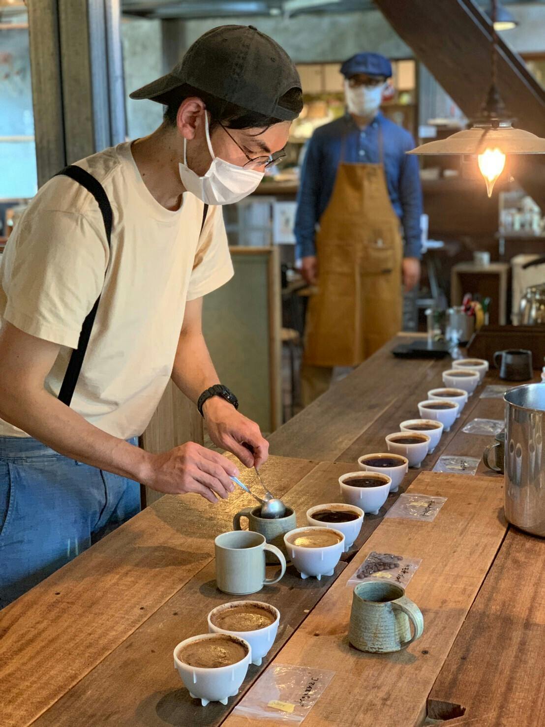 それを踏まえて今度は試飲用のカップに種類の違うコーヒーをいれてブレンドしていきます。例えばAの豆からスプーン1杯分、Bの豆からスプーン2杯分など。