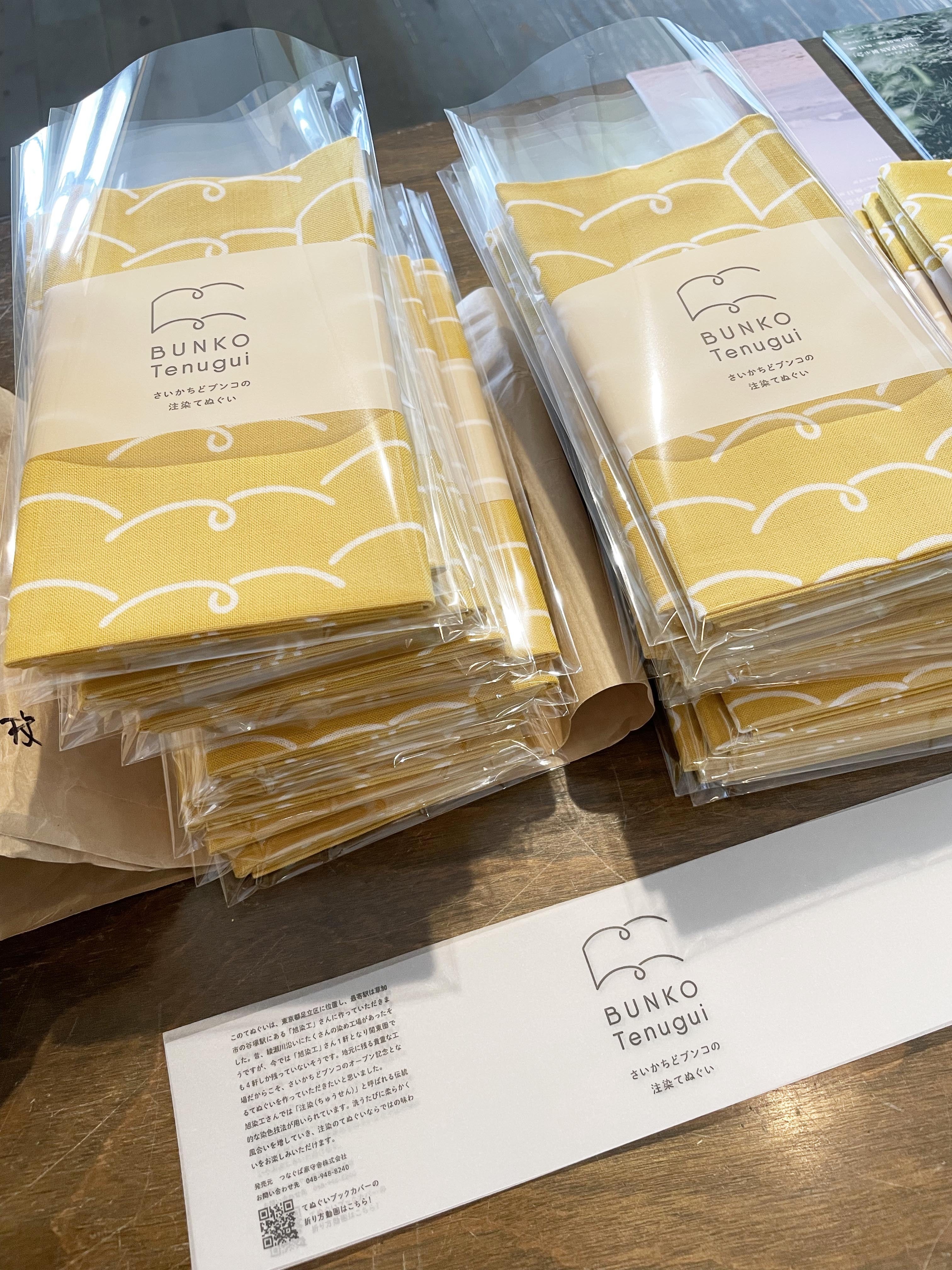 ブンコメンバーで撮影した手ぬぐいを使ったブックカバーの折り方動画のQRも載せました。すぐに捨ててしまうものだけど、その前にちょっと気になる内容をパッケージに仕込んでいます。お手元に届いた際は、ぜひご覧になってくださいね!