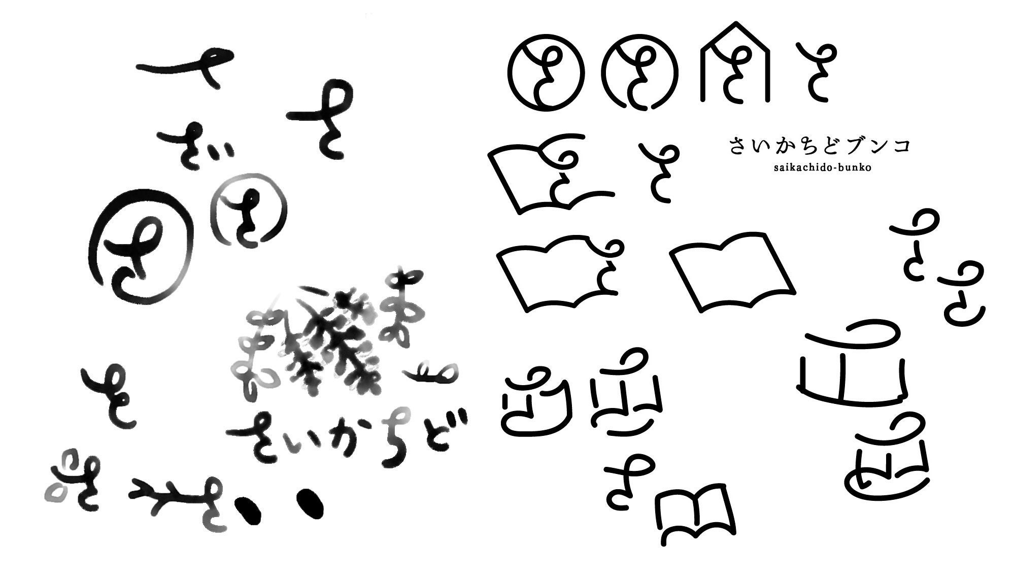これは提案前段階。手書きラフをベースに形を探っていた時です。丸や本の形の中にさいかちどの「さ」を入れたり、「さ」を本っぽくできないか試行錯誤している様子が伺えます。この時は「さいかちど(槐戸)」というワードがグルグルしていました。