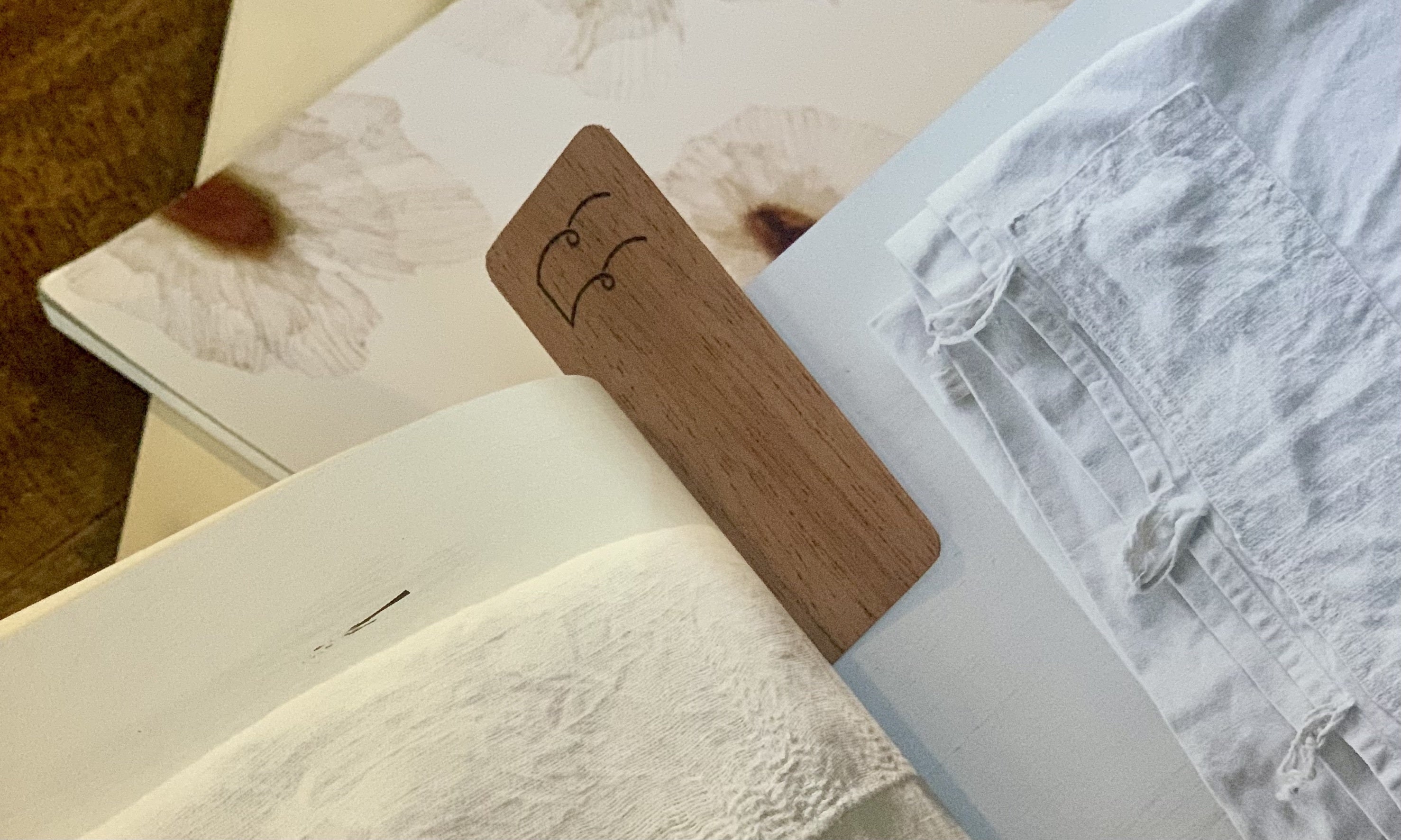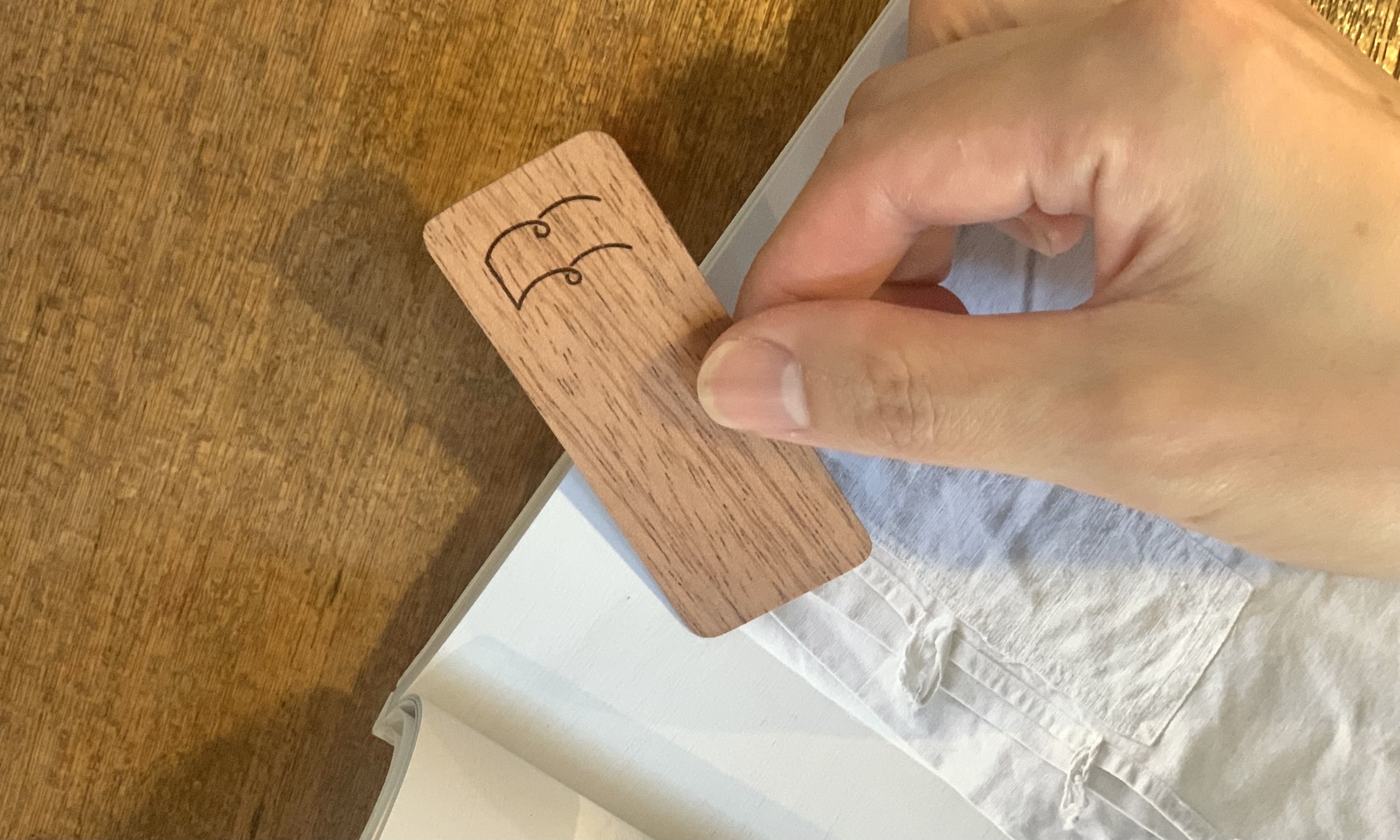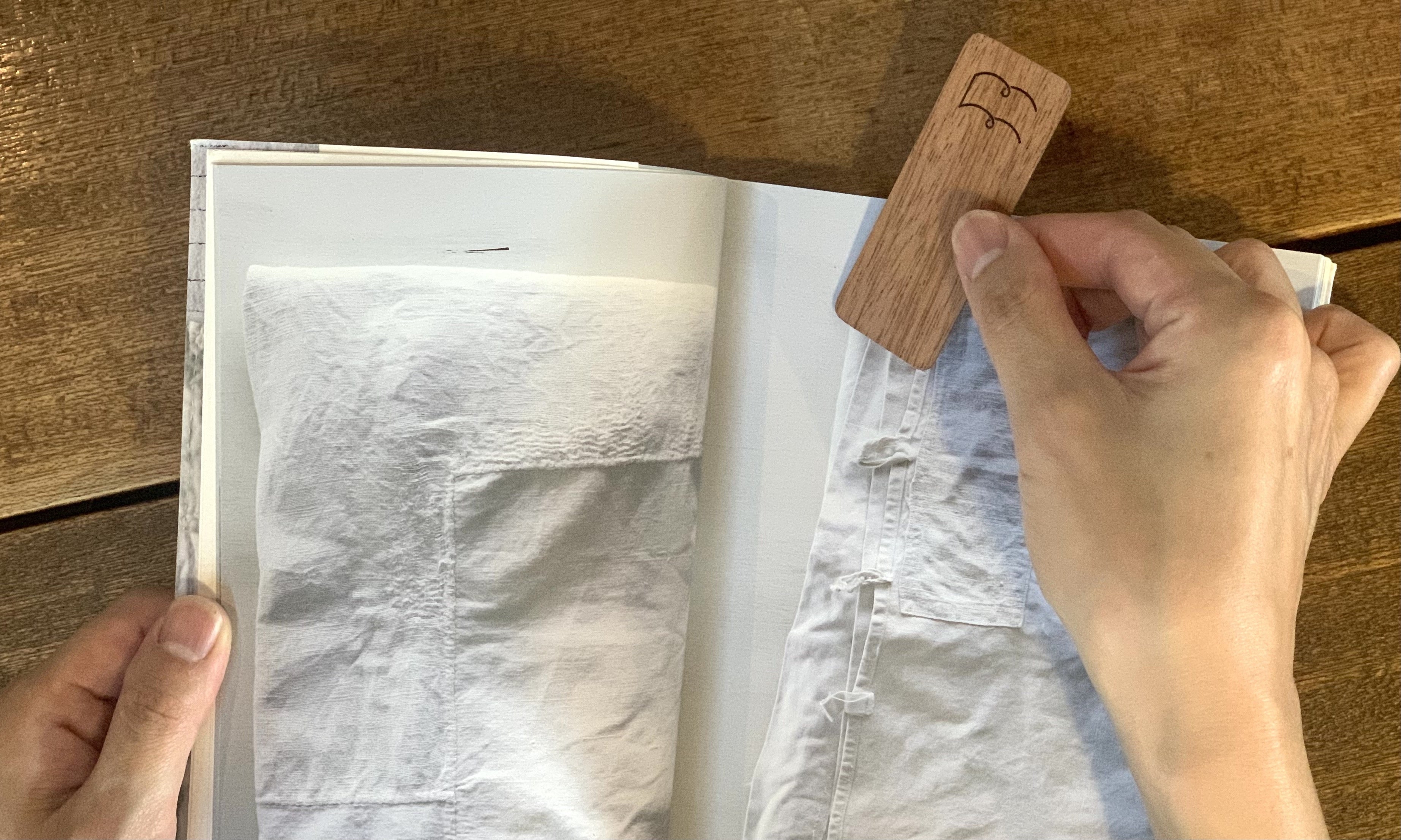 壁紙などに使用される突板の端材を3枚重ねてできた栞になります。