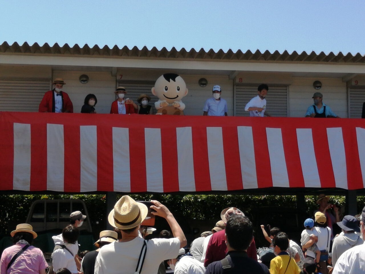 パリポリくんやつなぐばマスコットのトラオくんも駆けつけてくれてのお菓子まき。