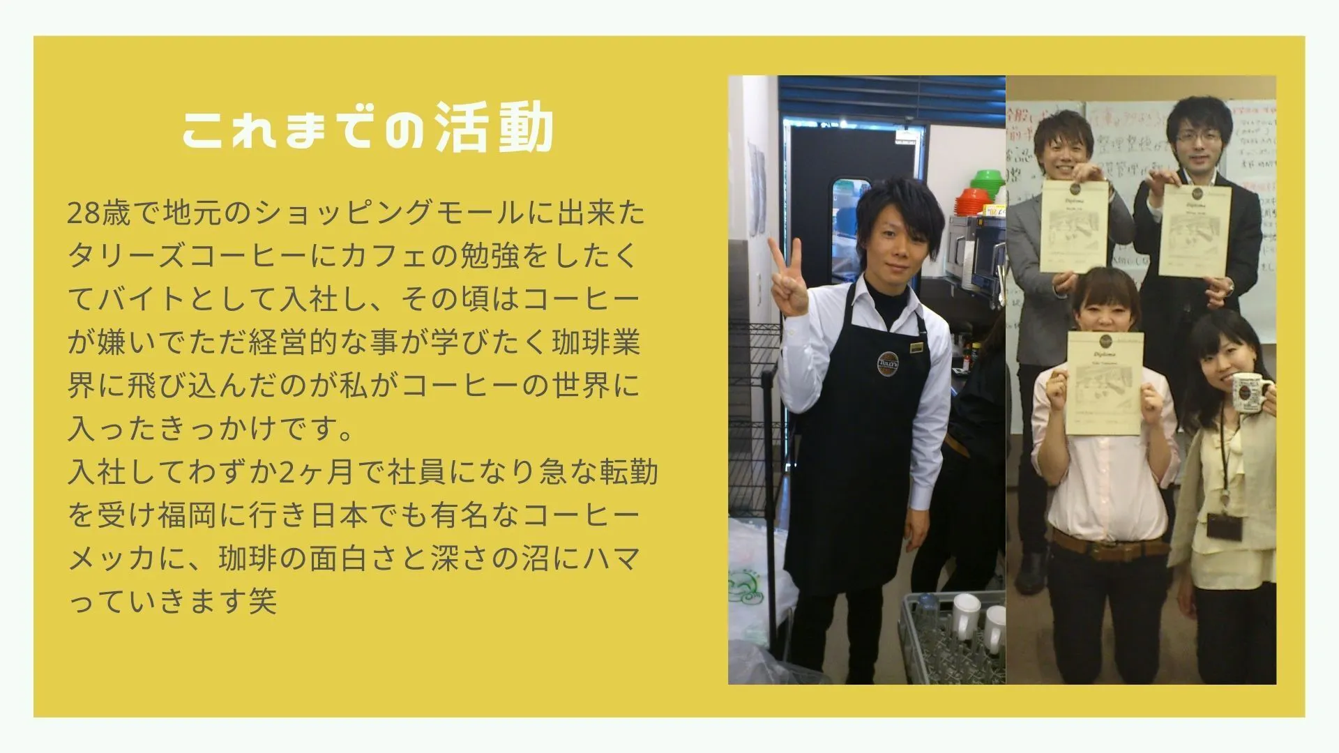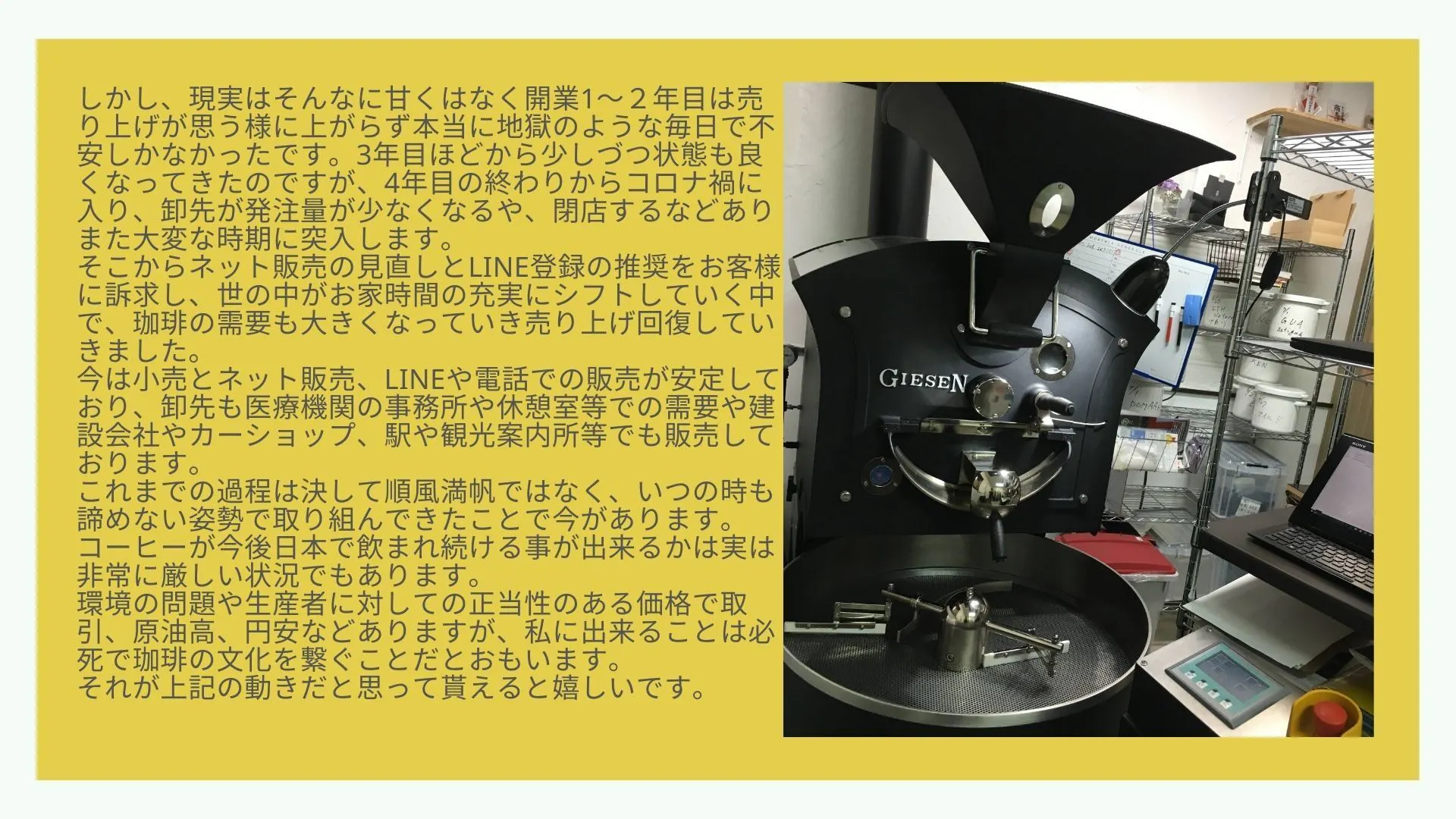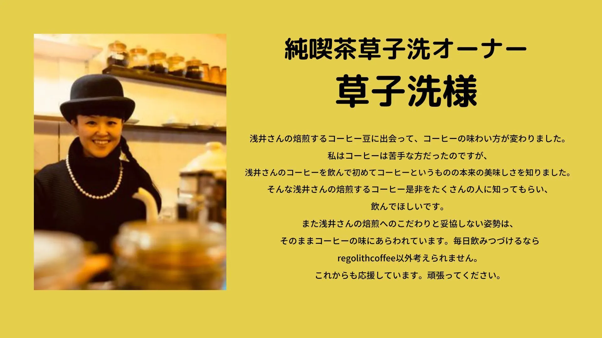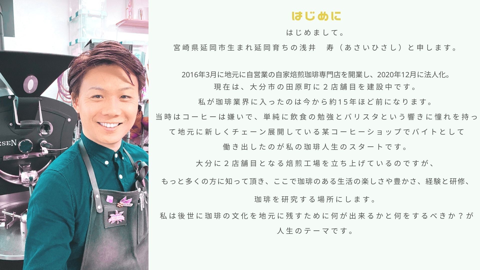 コーヒーが嫌いな私が珈琲を通して多くのことを学び、人として成長できたことを糧に、その楽しさと癒し今のコーヒーの生産状況やこれからの課題をしっかりとお伝えしながらお客様に寄り添い、文化として地元に残していきたいと必死でもがいております。