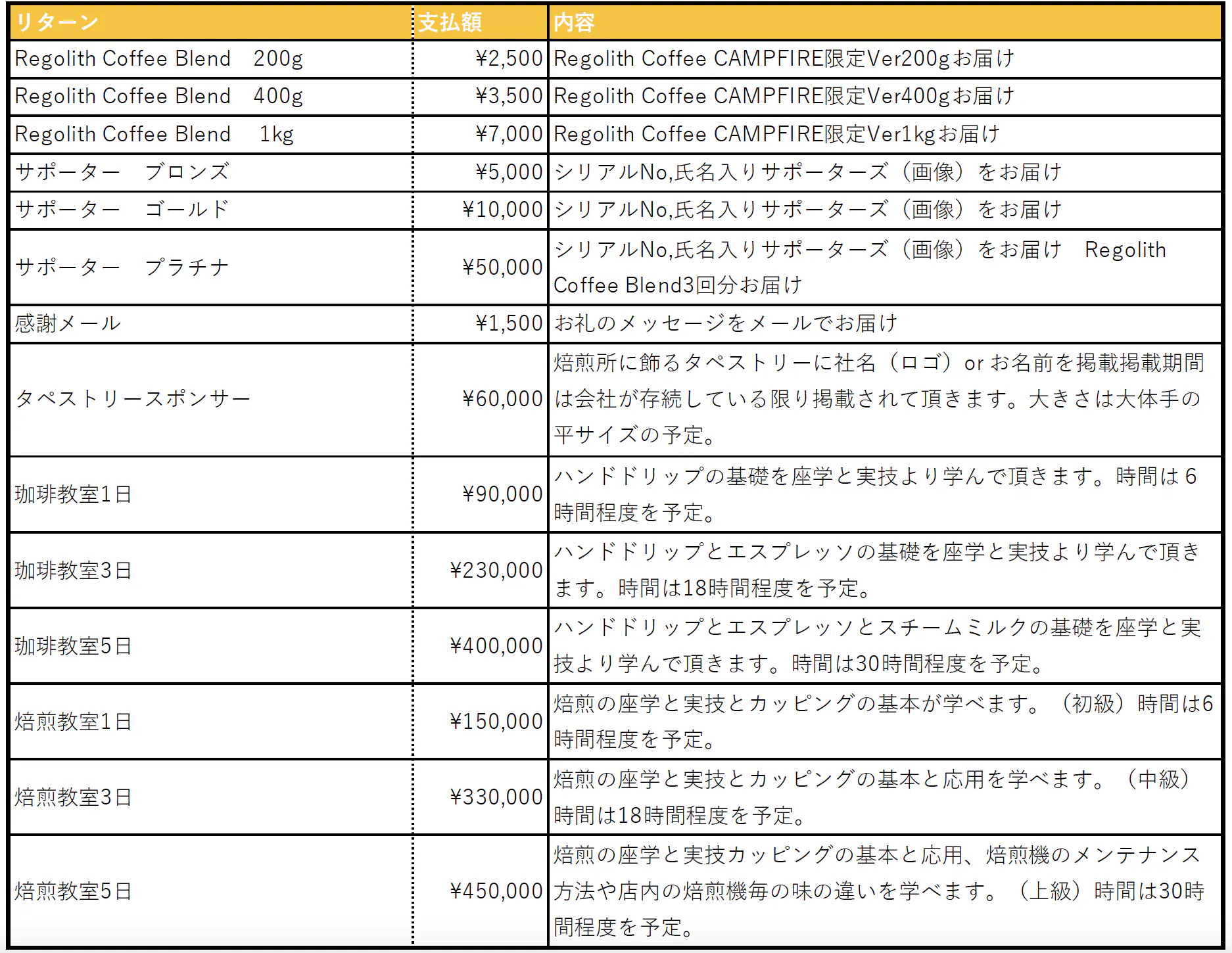 こんばんわ。確認したいことが少しあるのですがよろしいでしょうか? 7000円のリターンのコーヒーですが、いつ発想で、賞味期限がいつまでで、 1kgとなっていますが、まとめて一袋の中に1kgなのでしょうか? または、複数の袋に分かれているのでしょうか? また希望すれば、無くなるぐらいの数か月後に送っていただくことなどできるのでしょうか? すいませんが、よろしくお願いします。