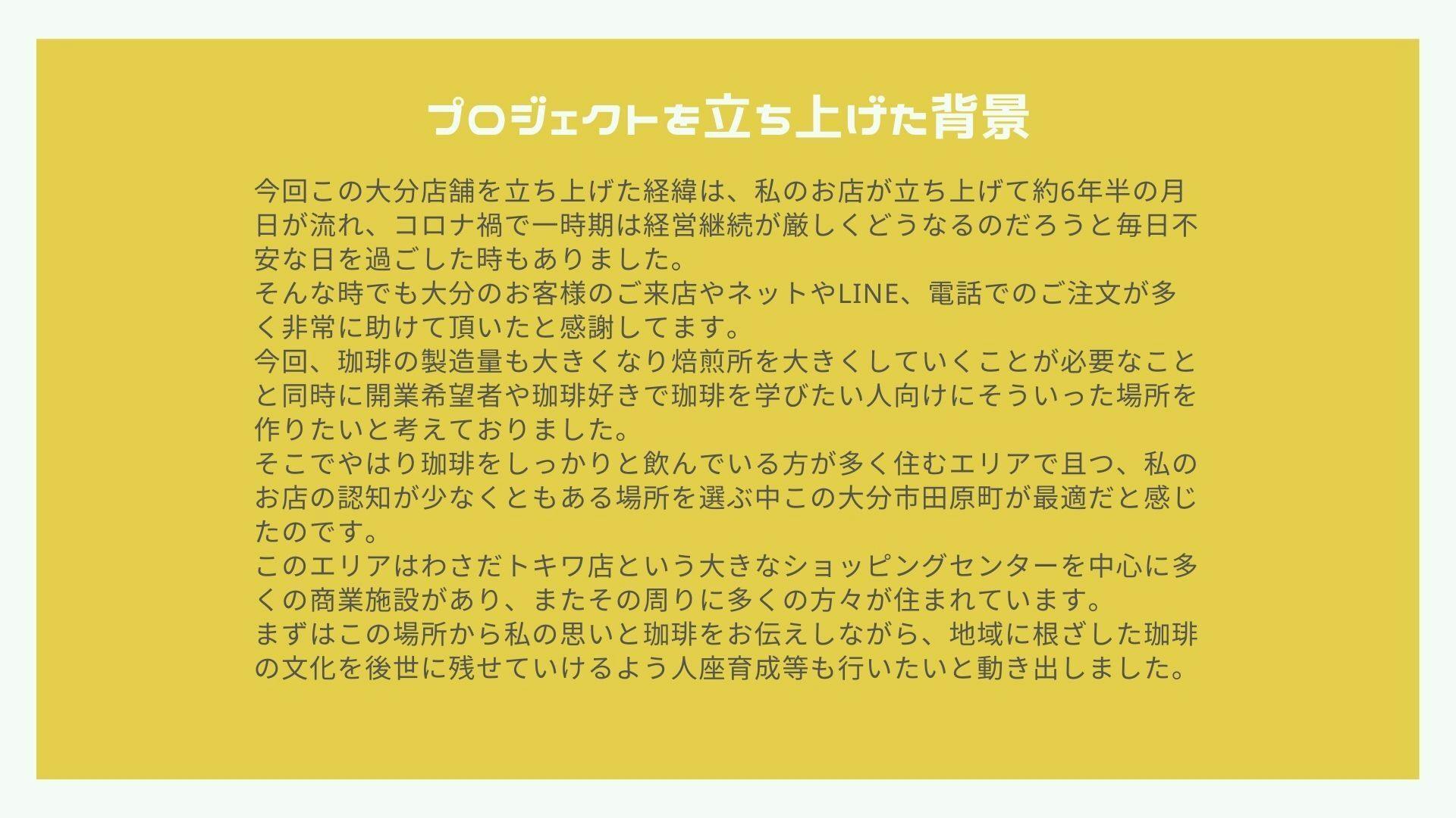 コーヒーが嫌いな私が珈琲を通して多くのことを学び、人として成長できたことを糧に、その楽しさと癒し今のコーヒーの生産状況やこれからの課題をしっかりとお伝えしながらお客様に寄り添い、文化として地元に残していきたいと必死でもがいております。