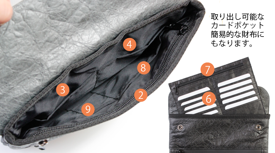 ③④名刺入れや免許証入れなど収納するのに便利な小物ポケット
