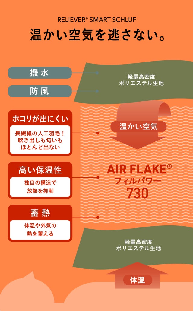 中綿AIR FLAKE®️は研究の末にたどりついた 独自の構造で、放熱を抑制し、 圧倒的な保温力を発揮。