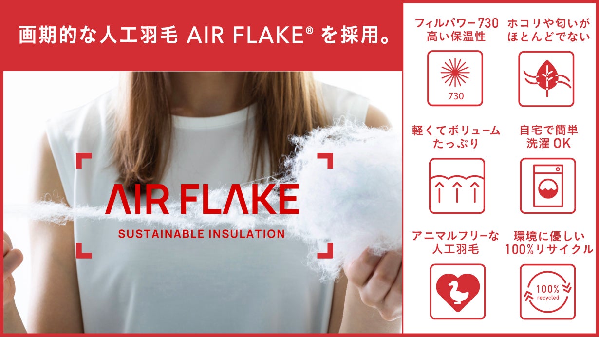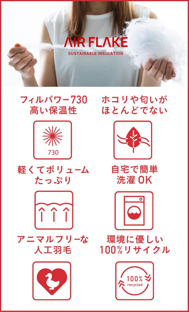 100%リサイクル原料で作られ、限りある天然素材の羽毛に頼ることのないAIR FLAKE®︎は、幅広い社会貢献の可能性を秘めた、サステナブルな社会の実現に貢献できる素材なのです。