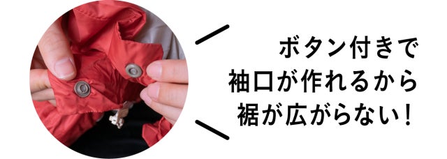羽織ってジッパーを胸元まで上げて、ボタンを留め袖口を作るとポンチョスタイルに!激しく動いてもジッパーはずり落ちることなく、ボタンも外れません!