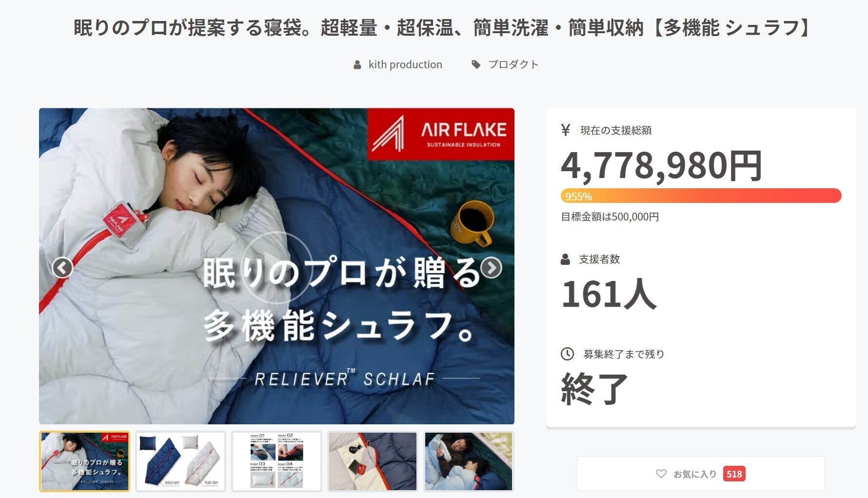 2022/07/22 08:43沢山のご支援ありがとうございます。ついに目標金額を達成しました(祝)ありがとうございます。これ1枚あれば、本当に便利なスマートシュラフ!中綿の人工羽毛「サステナブル・エアーフレイク」は実は、大手アウトドアメーカーに採用されてます。https://www.youtube.com/watch?v=eH1PZ5BbQD8そんな中綿を使用した、シュラフは世界でここだけです。ぜひ、引き続きの、応援とSNS拡散よろしくお願いします。 もっと見る