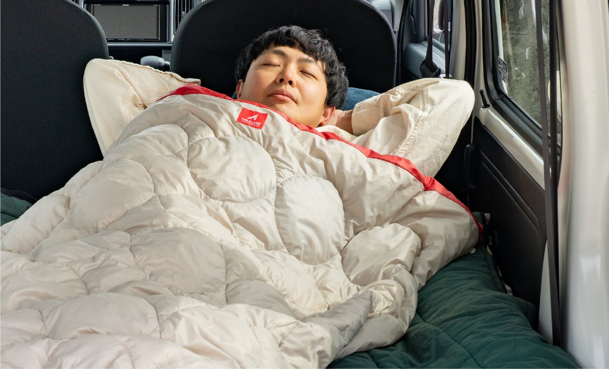 夏の釣り、車内の仮眠でも。足先と背面が開いたバックオープン型シュラフに早変わり。いつでも、どこでも、快適に眠れます。