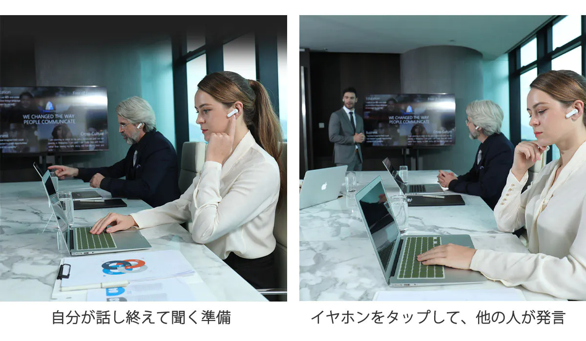 タッチモードは、自分の発言を聞いてもらいたい時に最適なモードです。イヤホンをタップすれば、マイクはいつもあなたの声だけを拾います。発言中、他のマイクはミュートされ、翻訳されたあなたのメッセージが聞いている人全員に届きます。