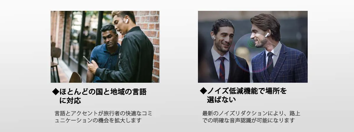 多様な言語に対応しているので、ほとんどの国や地域で不自由なく旅行を楽しむことができます。またノイズリダクション機能が搭載されているため、路上や市場など周囲の音が気になる場面でも問題なく翻訳することができます。