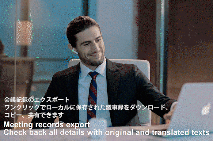 グループチャットモードを使用する際には、「議事録エクスポート」機能も大いに役に立つでしょう。専用アプリを利用すると、会議中の音声が希望の言語に翻訳された状態で自動的にクラウド上に保存されます。