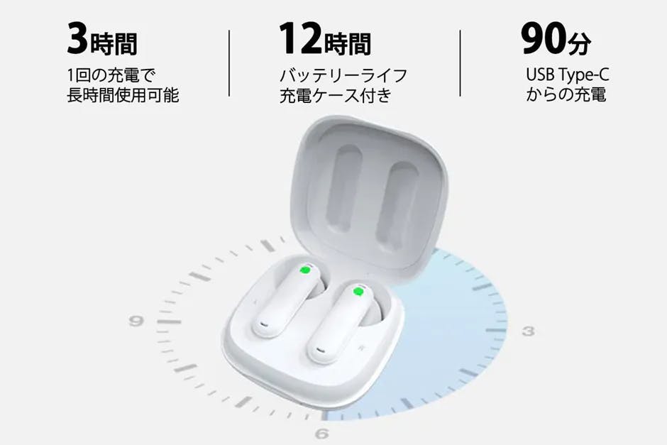 A: イヤホンと充電ケースの両方がフル充電されるまでに約90分かかります。