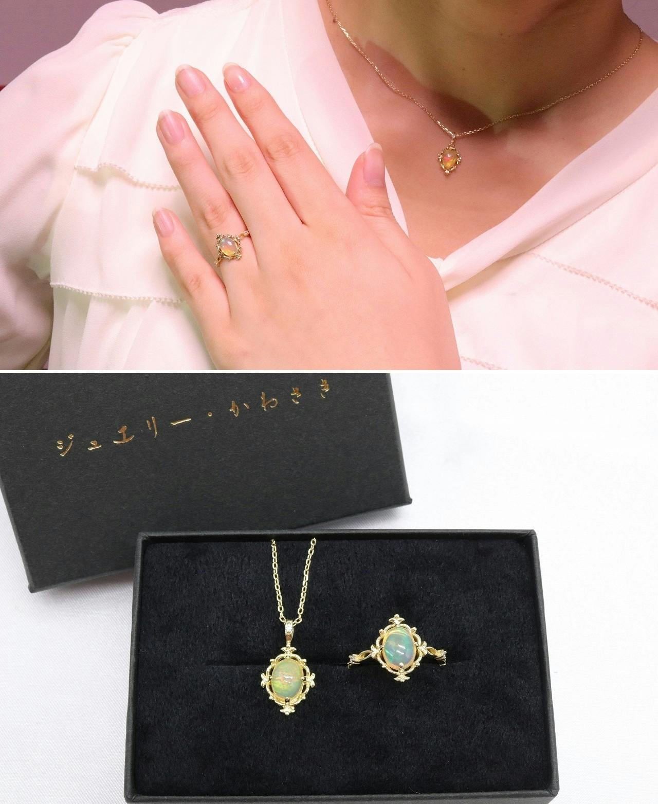 リング、ネックレスそれぞれで際立つ存在感を放つファイヤーオパール。セットでおつけいただくことで存在感は何倍にもなります!