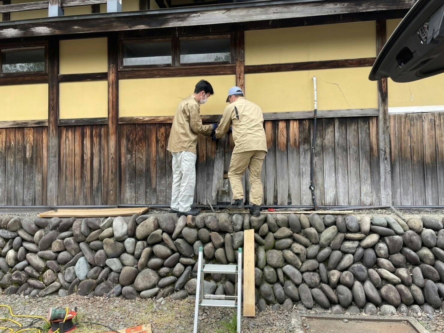 木の板が一枚ずつ丁寧に塗られていき、外観は新しい建物かのような印象に生まれ変わりました。