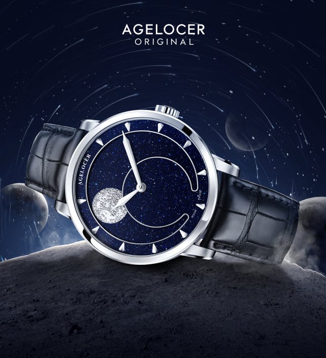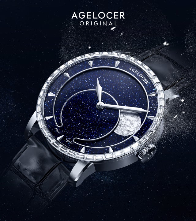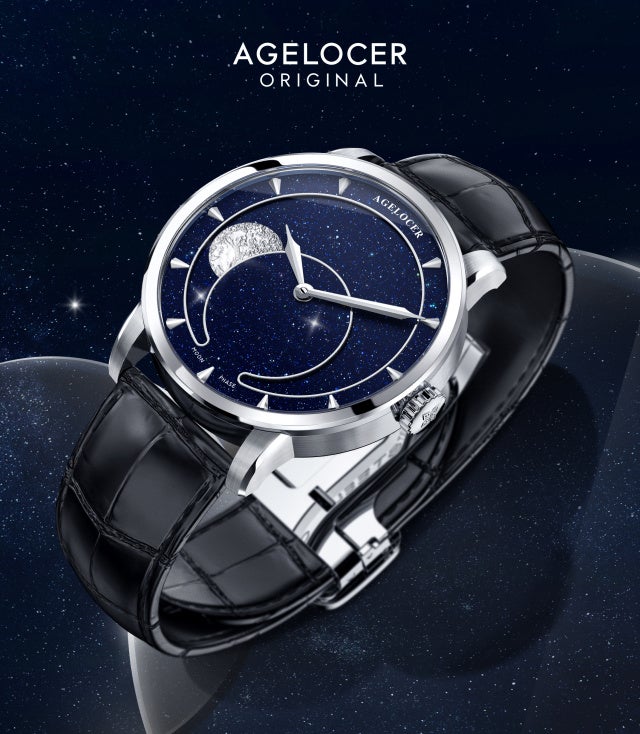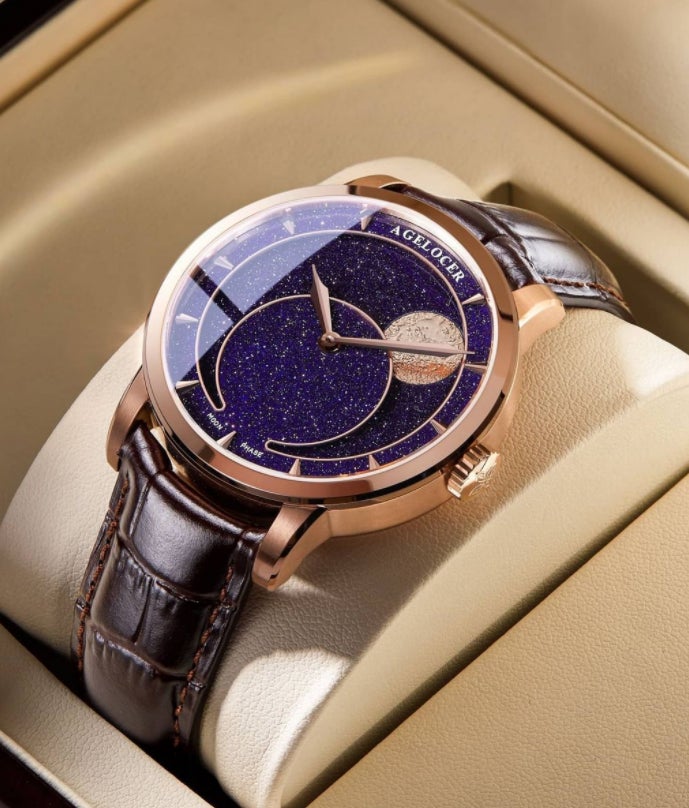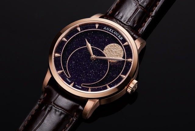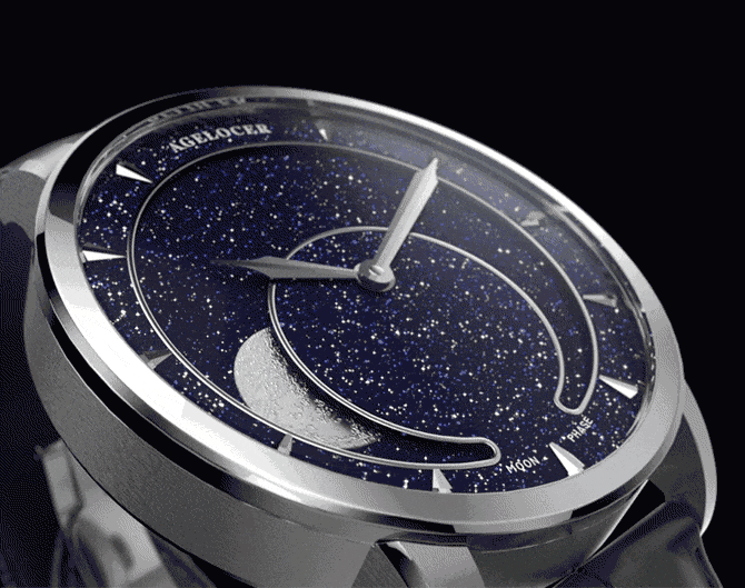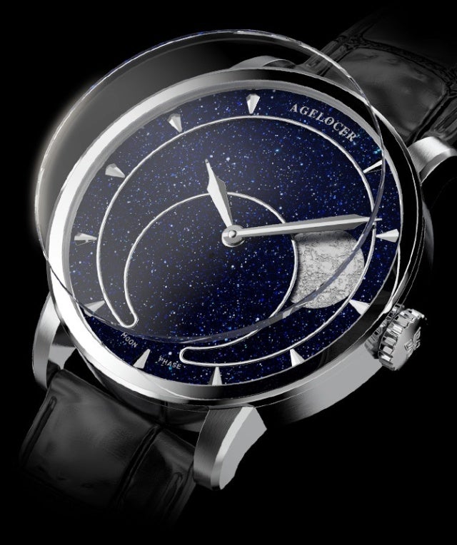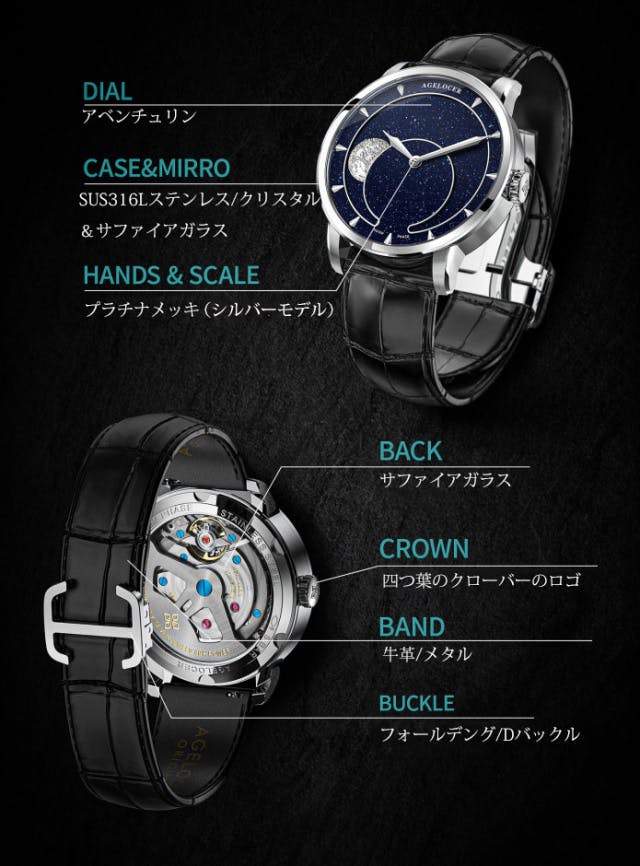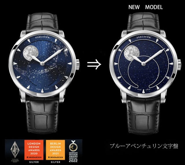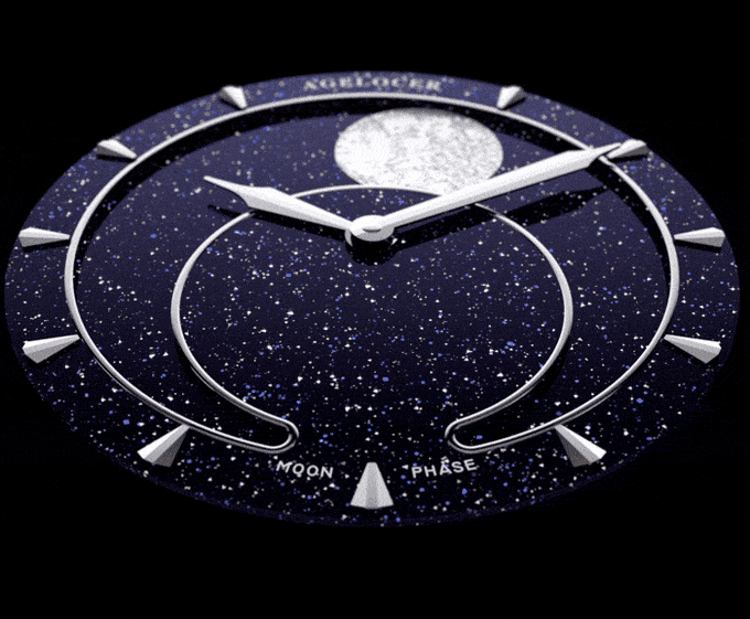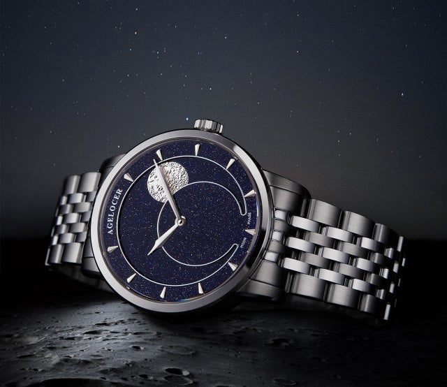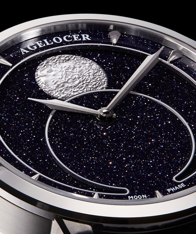 AGELOCERはスイスのデザインスタジオBUGME GmbHと提携し、ムーンフェイズコンプリケーションと夜空に浮かぶ星のように細かい粒子が輝く天然素材アベンチュリンダイヤルを組み合わせたユニークなデザインの腕時計としました。