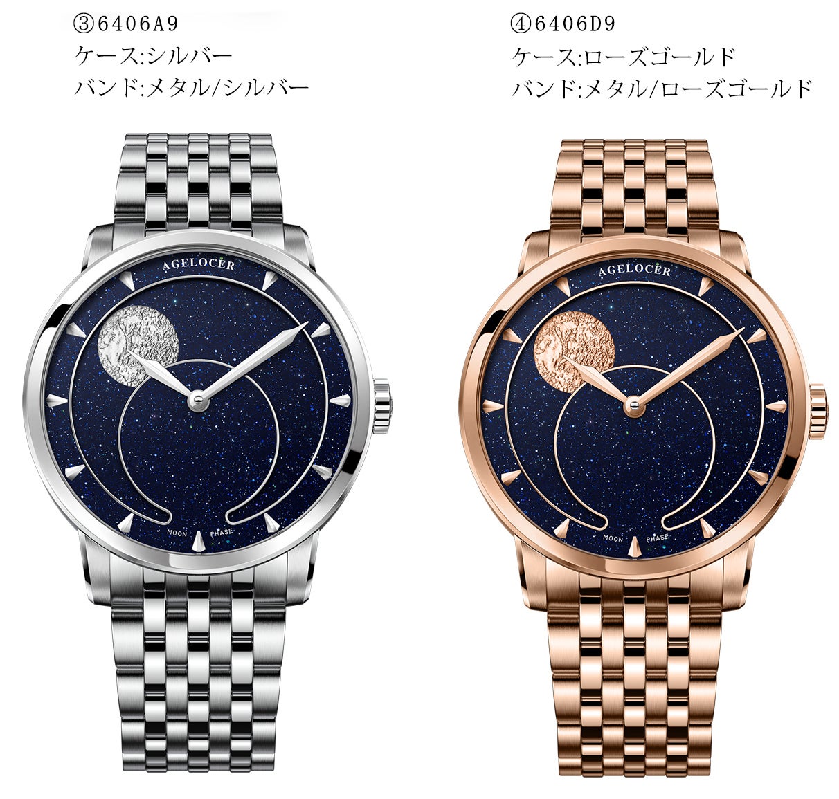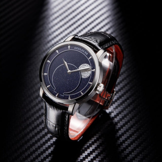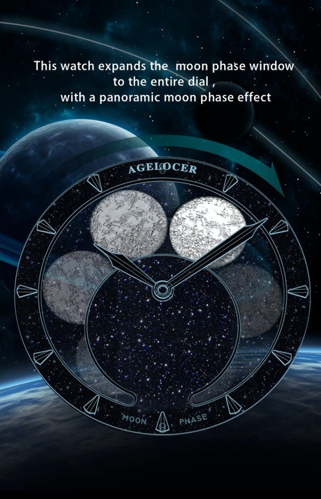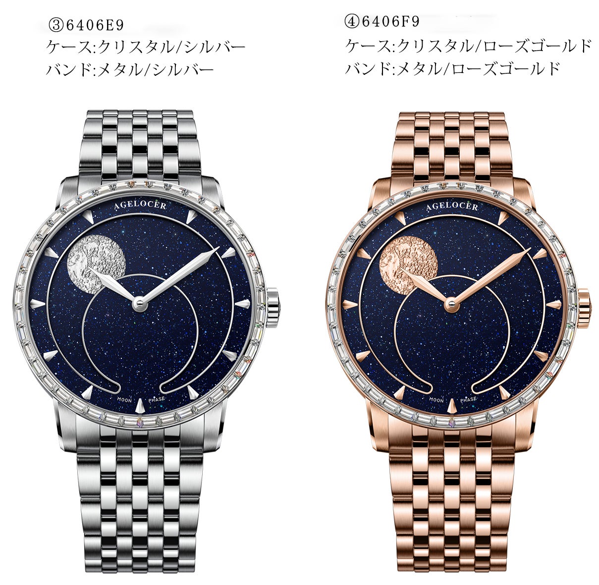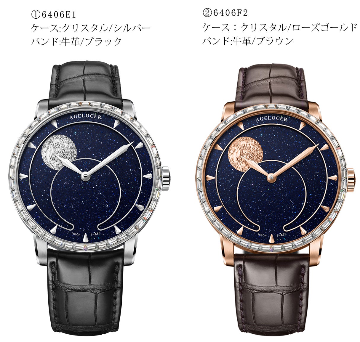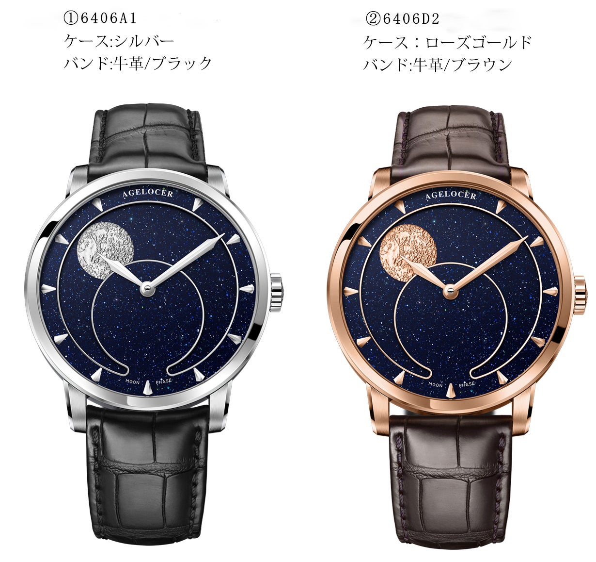 AGELOCERはスイスのデザインスタジオBUGME GmbHと提携し、ムーンフェイズコンプリケーションと夜空に浮かぶ星のように細かい粒子が輝く天然素材アベンチュリンダイヤルを組み合わせたユニークなデザインの腕時計としました。