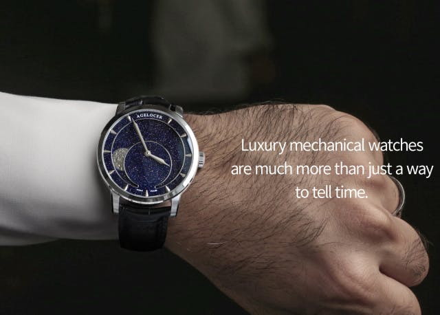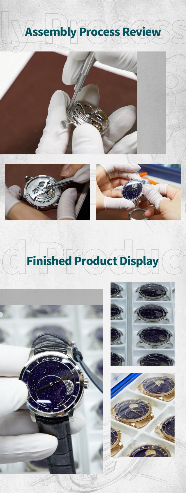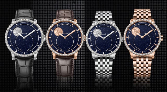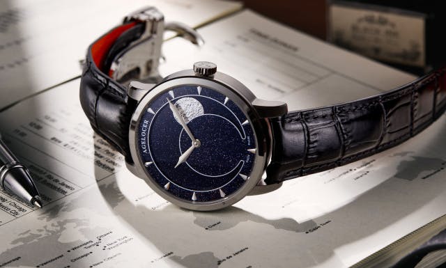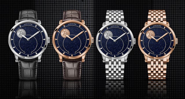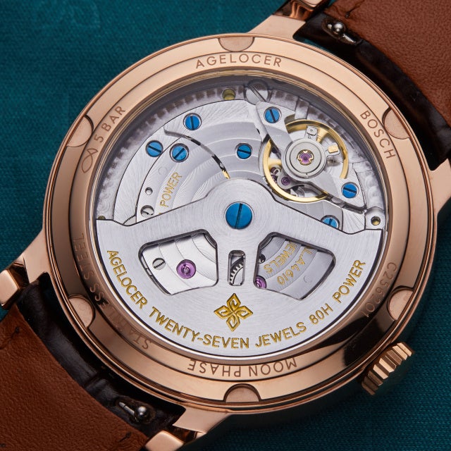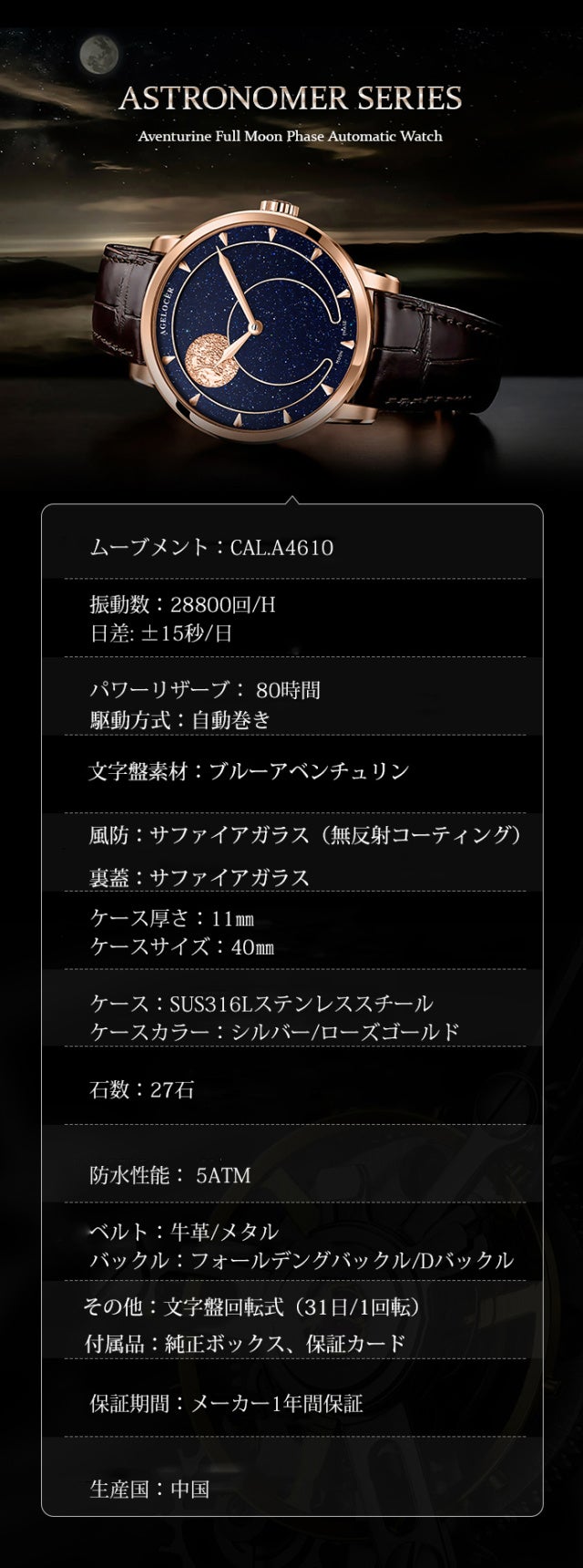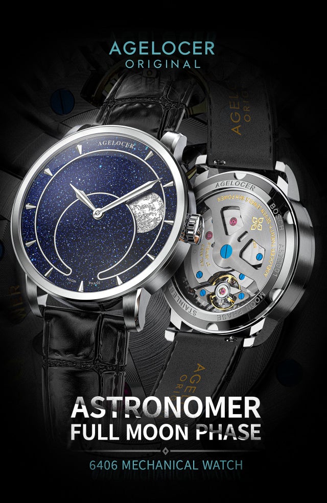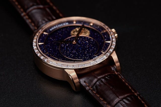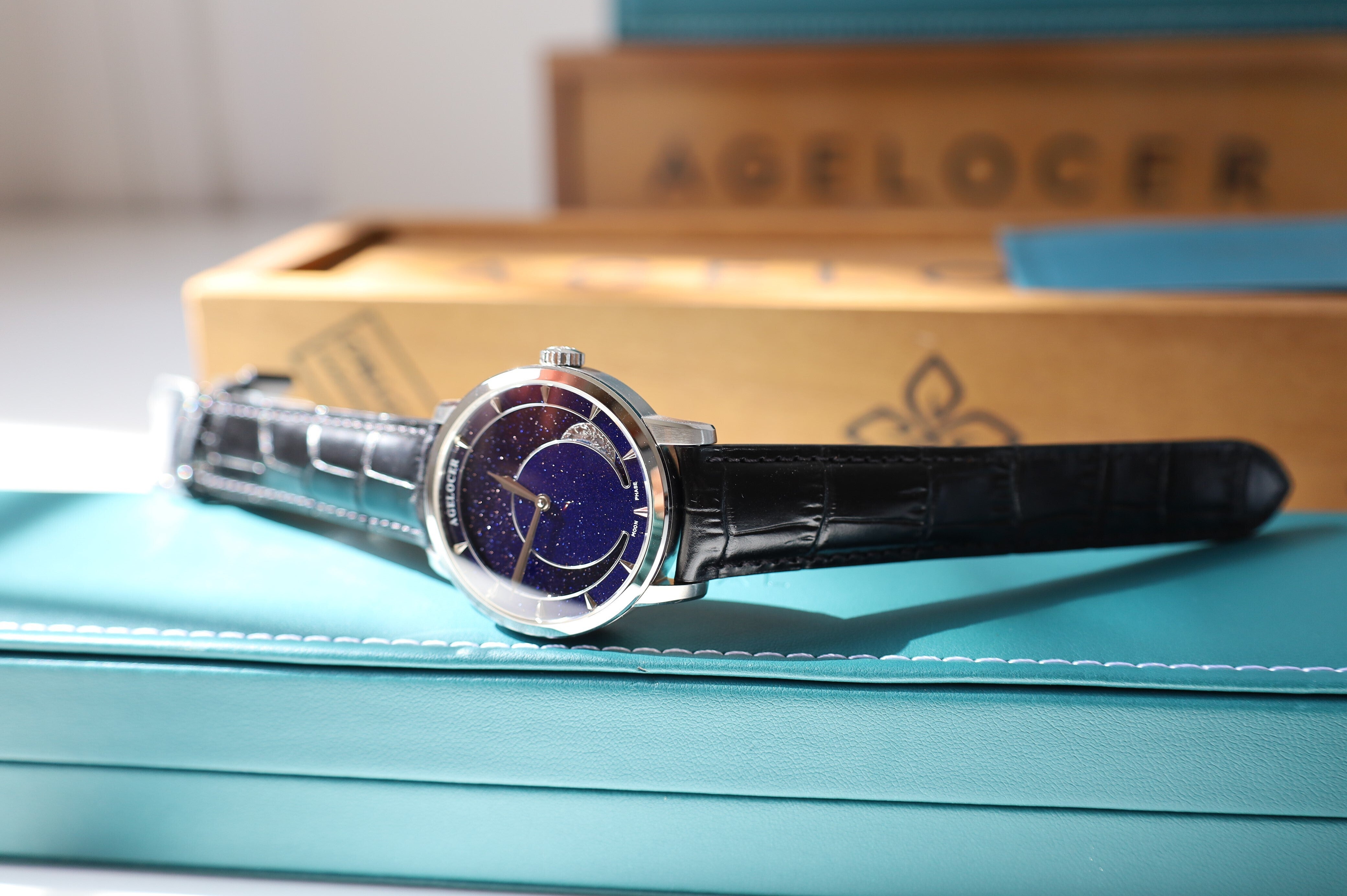 AGELOCERはスイスのデザインスタジオBUGME GmbHと提携し、ムーンフェイズコンプリケーションと夜空に浮かぶ星のように細かい粒子が輝く天然素材アベンチュリンダイヤルを組み合わせたユニークなデザインの腕時計としました。