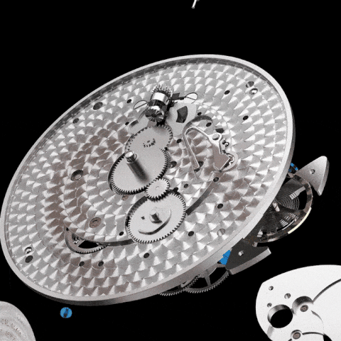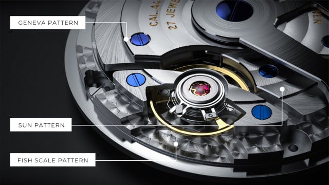 時計の最も著名な装飾技術のコート・ド・ジュネーブ加工や、魚の鱗を模ったパーラージュ加工や、エッジに表面に美しい光沢を出す鏡面仕上げと、インパクト効果を狙う為、ブラッシュ仕上げを施し繊細な模様で質感を活かしています。