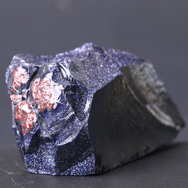 正式にはアベンチュリンクオーツ(和名:砂金水晶)といい、鉱物などの微細片に光が反射し、キラキラ輝くことを指すアベンチュレッセンスという現象に由来しています。