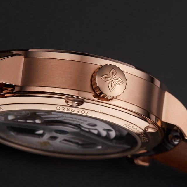 伝統的に用いられてきたムーンフェイズ小窓を文字盤全体に拡張し、星空のようにキラキラと輝き、無限の夜空を思わせるアベンチュリン文字盤を採用しました。