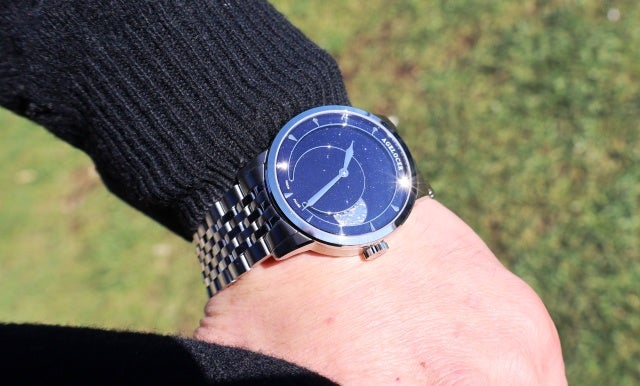 弊社で使用してみた感想としては、デザインのコンセプトとなっている大きなムーンフェイズウインドウが非常に印象の強い腕時計でした。機械仕掛けで動く美しい月は機械式腕時計ならではの良さやロマンを感じさせてくれ、とても素晴らしい機能でした。満天の星空に見立てたアベンチュリンの文字盤はまさに夜空に煌めく星々の輝きのようでムーンフェイズデザインと非常にマッチした素材だと思います。夜間照明が一晩中照らされている街の中では見ることが難しい満天の星空を腕元で眺めると心が癒やされました。