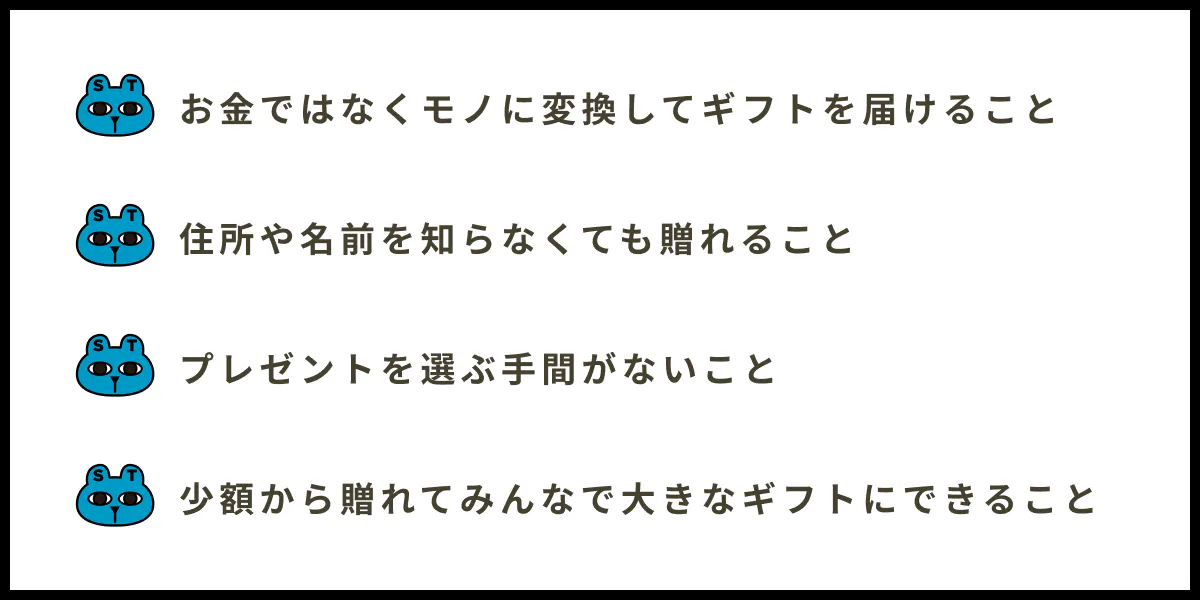 コロナ禍を経験して、「残業してる同期からコーヒー一本もらう(あげる)」みたいなオフラインでの小さなモノのやりとり、モノに感情(感謝)を乗せたやりとりも減ってしまいました。少しずつオフラインの機会が戻ってきた中でも、インターネットを介してちょっとした感謝を贈れるサービスは「感謝の循環」を生み出すきっかけにできるんじゃないかとぼくたちは信じています。