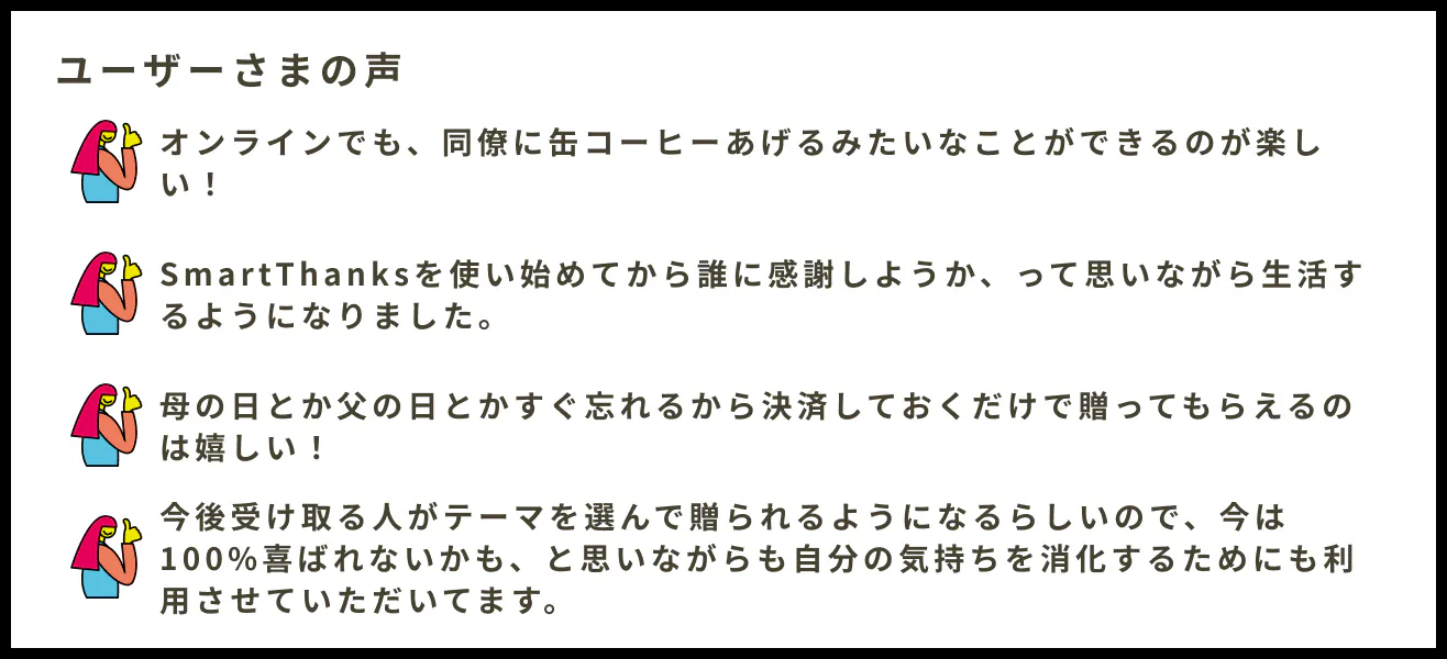 SmartThanksは欧米のチップ文化を参考にbHAPを進化させたサービスですが、チップそのものを再現したプロダクトではありません。友達にお土産を買ったり、おうちに遊びにいくときに差し入れを持参するようなイメージで、「ありがとう」を形にして贈れるサービスです。
