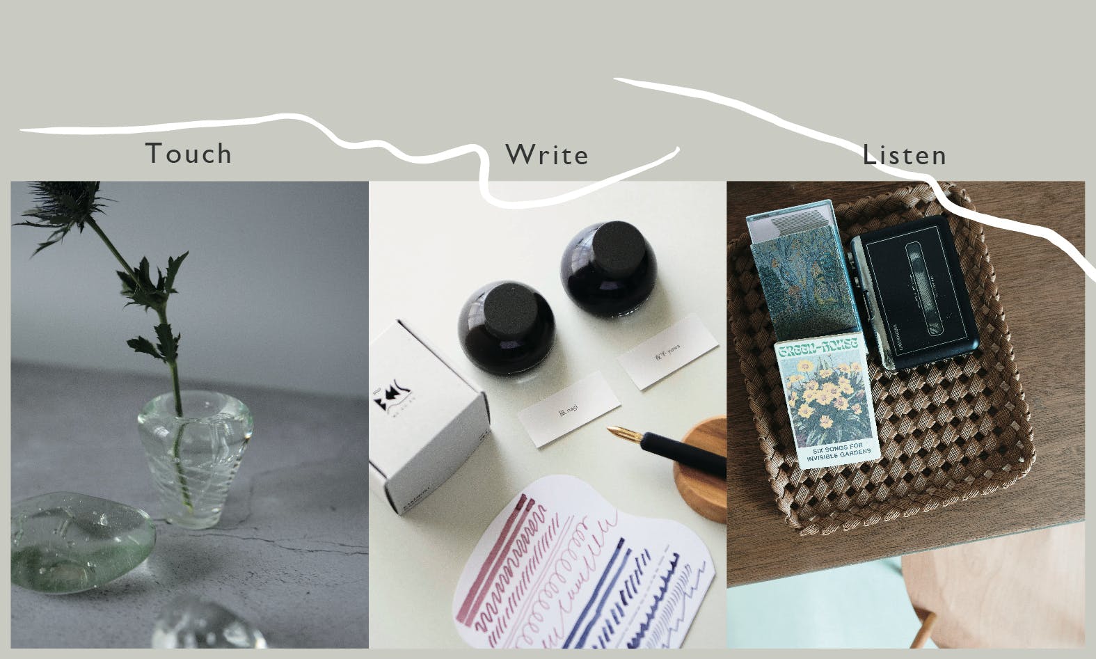 海や山など自然の景色を見て、思ったことを紙に書き出してみたり、音楽をゆっくり聴いてみたり、お香を焚いたり、お茶を淹れたり...日常的な情報と自分との共存の仕方を見直し、内在する自身の感覚に目を向けられる体験を提供します。